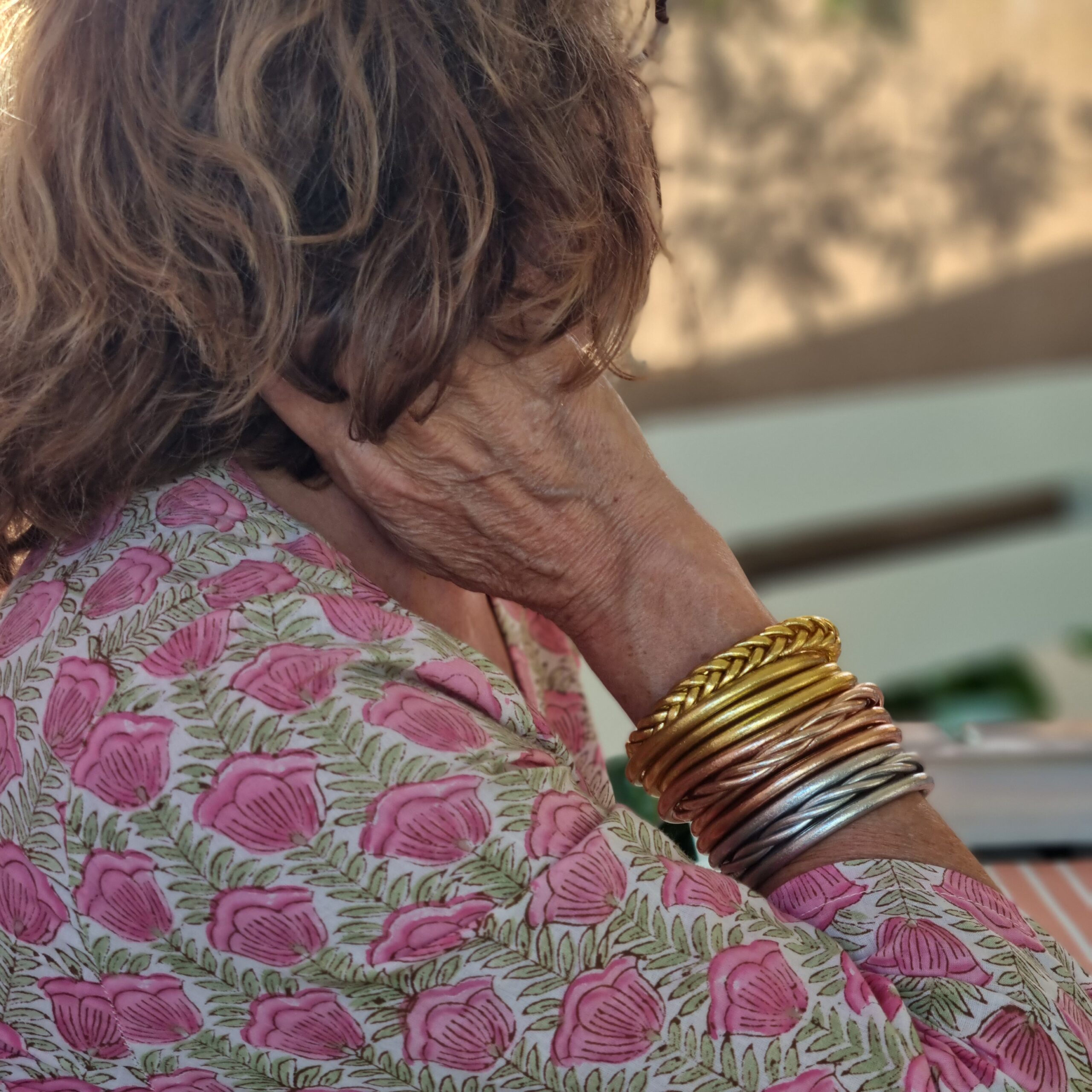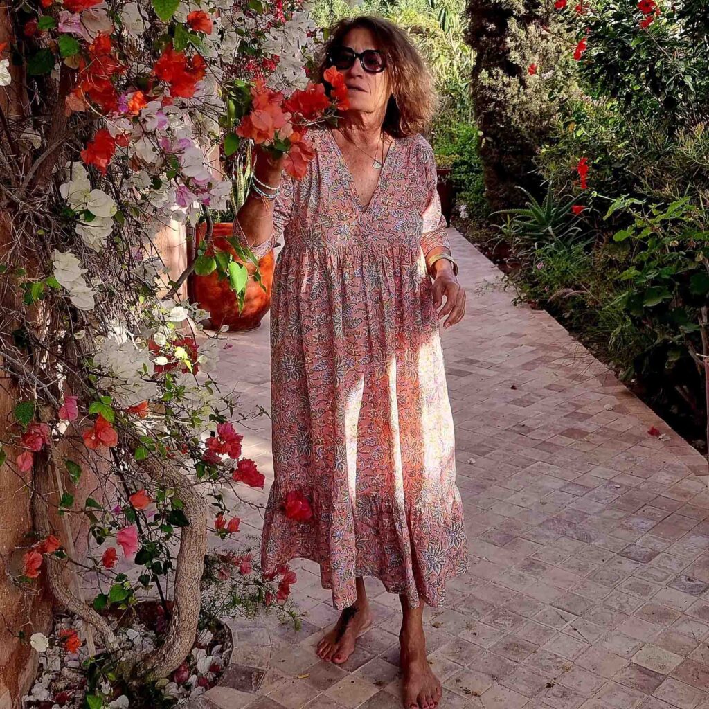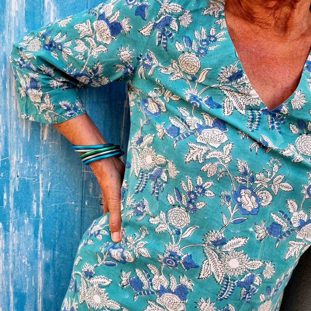 Mon paréo, imprimé à la main, en coton, ne me quitte jamais en jupe ou foulard pour le soir !