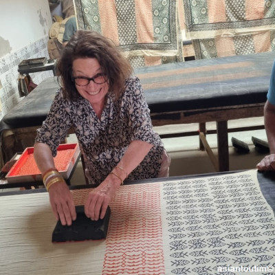 La technique Sanganer, du nom de la région où l'on fabrique ces grands foulards est spécialisée dans les tons naturels fleuris imprimé à la main à l'aide d'un block de bois où le motif a été gravé à la main.