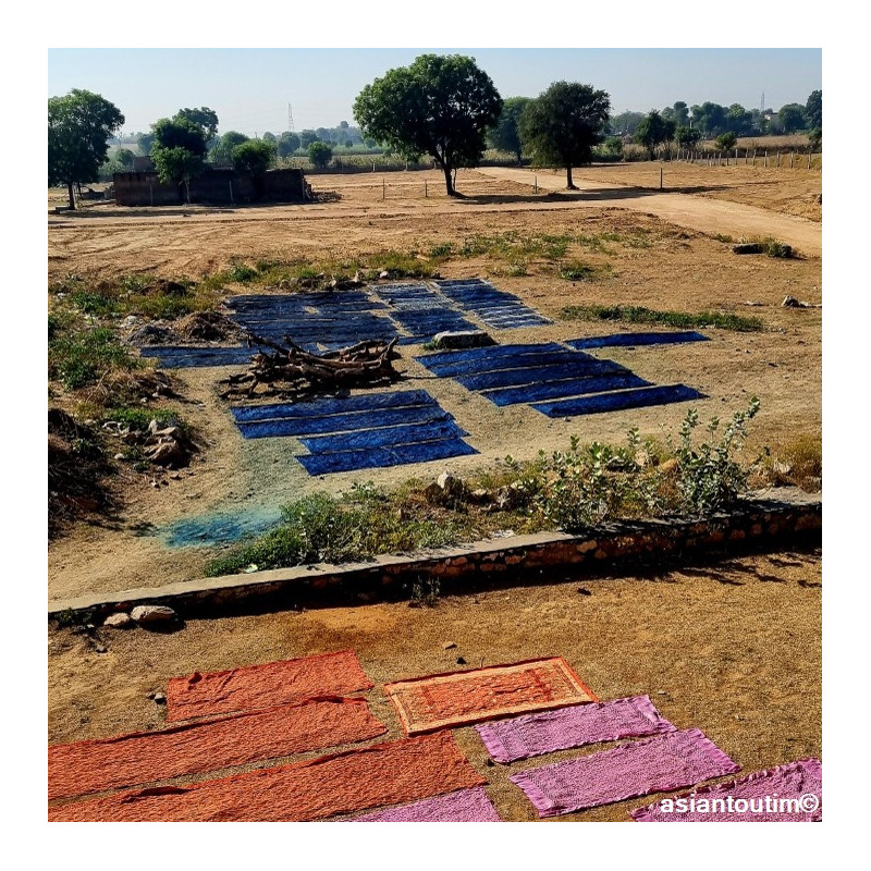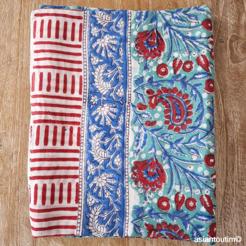La technique Sanganer, du nom de la région où l'on fabrique ces grands foulards est spécialisée dans les tons naturels fleuris imprimé à la main à l'aide d'un block de bois où le motif a été gravé à la main.
