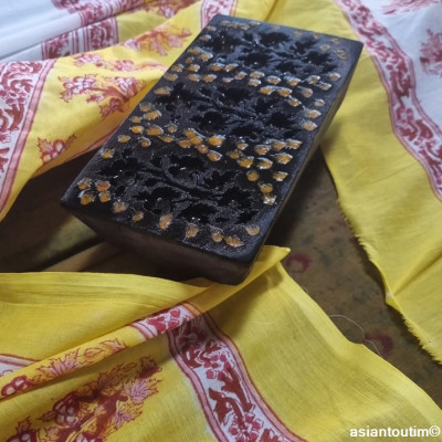 100 % coton, origine Inde. Il se peut que par la technique d'impression manuelle quelques imperfections apparaissent c'est un travail manuel et votre étole reste unique.