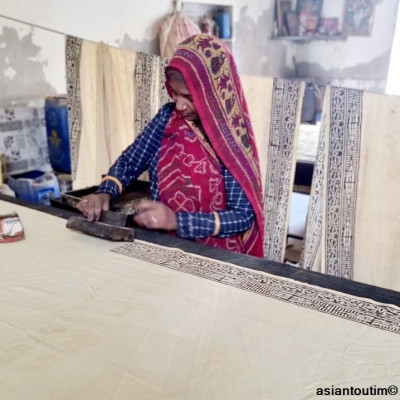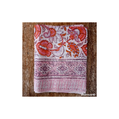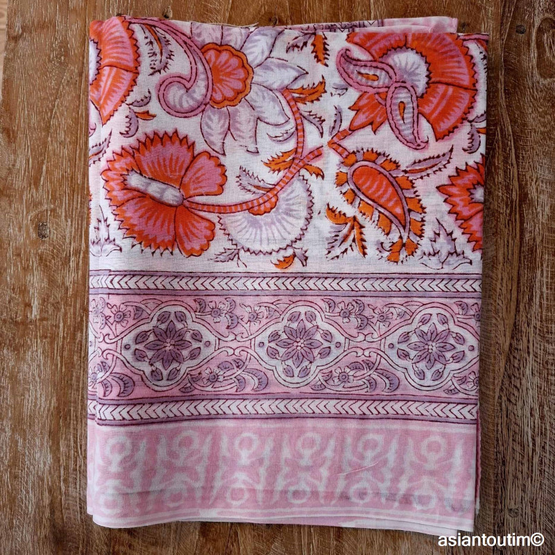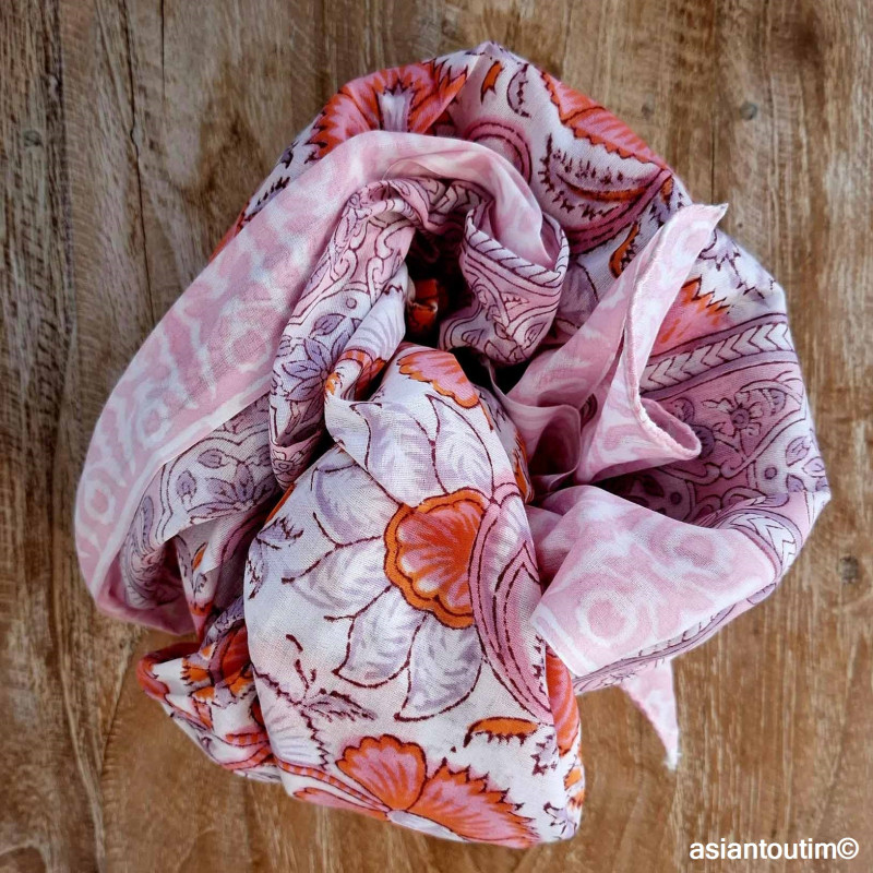 La technique Sanganer, du nom de la région où l'on fabrique ces grands foulards est spécialisée dans les tons naturels fleuris imprimé à la main à l'aide d'un block de bois où le motif a été gravé à la main.