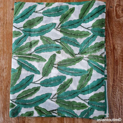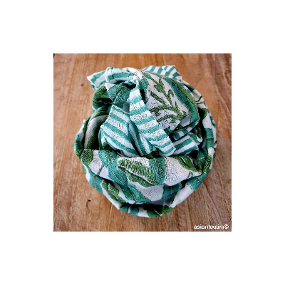 La technique Sanganer, du nom de la région où l'on fabrique ces grands foulards est spécialisée dans les tons naturels fleuris imprimé à la main à l'aide d'un block de bois où le motif a été gravé à la main.