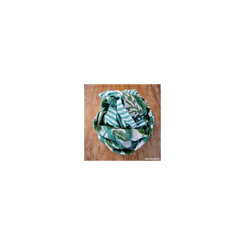 Elle mesure 180 cm par 110 cm environ et peut s'utiliser en foulard, paréo, déco. Se lave de préférence à la main.
