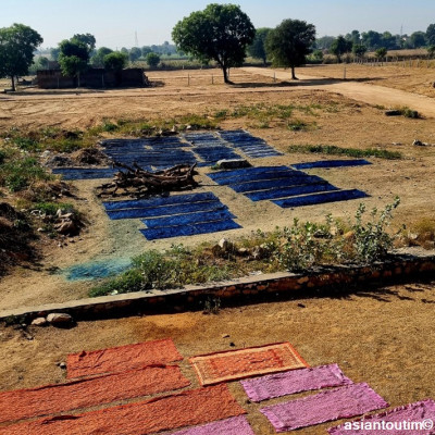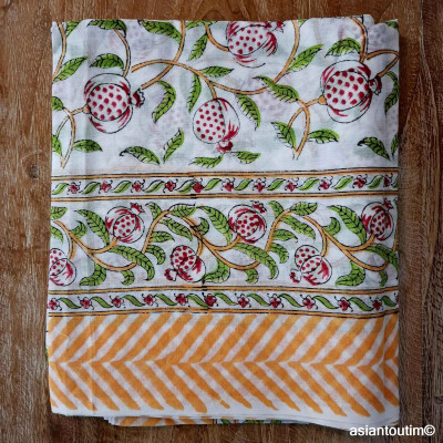 La technique Sanganer, du nom de la région où l'on fabrique ces grands foulards est spécialisée dans les tons naturels fleuris imprimé à la main à l'aide d'un block de bois où le motif a été gravé à la main.