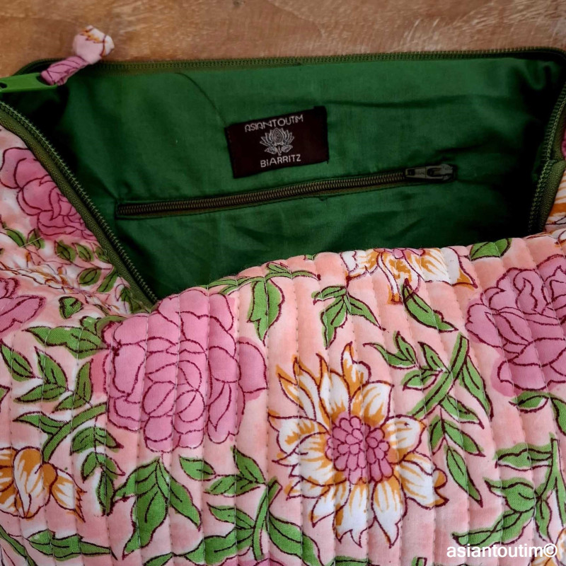Lulu la grande pochette plate matelassée coloris Flora100 % coton, imprimé à la main grâce à la technique du tampon de bois ou hand block print, technique d'impression ancestrale indienne.