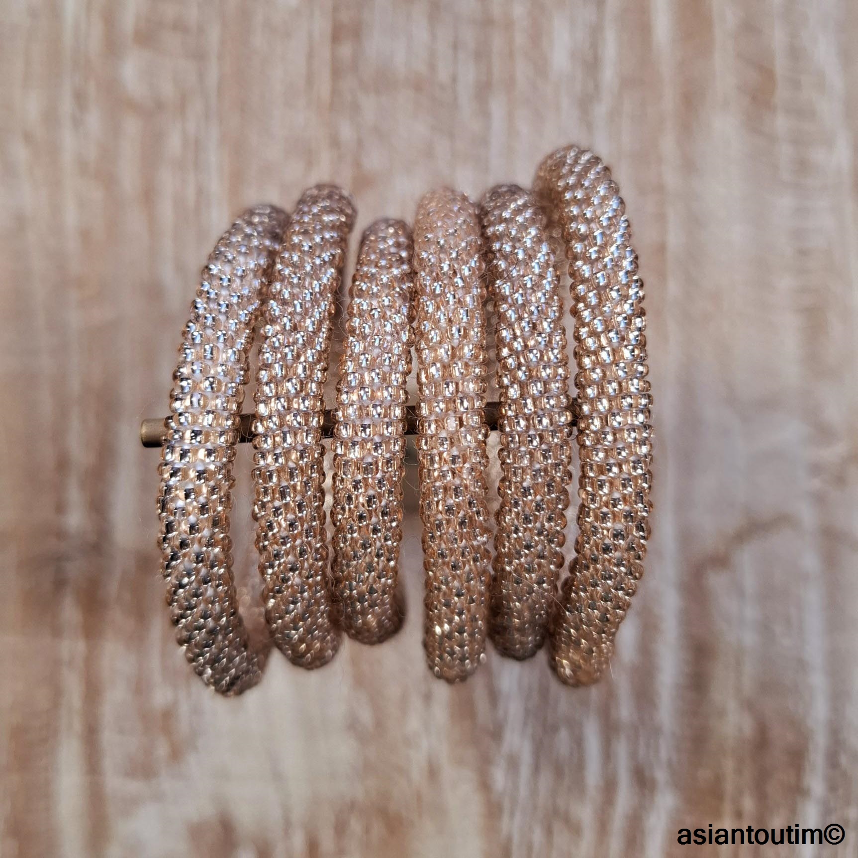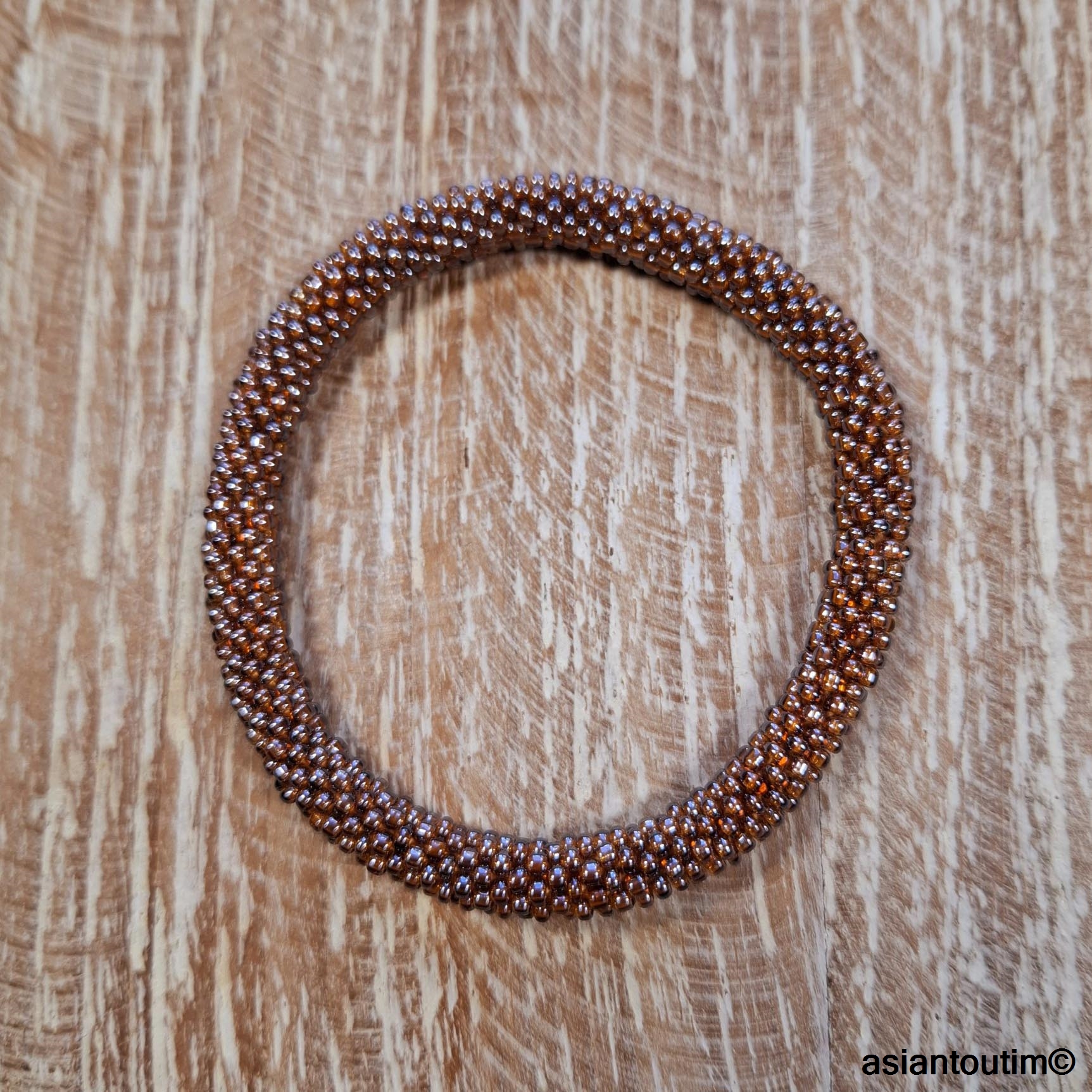 ✨ Bracelet artisanal népalais roll-on, crocheté à la main avec un fil de coton légèrement élastique et des perles de verre dorées.