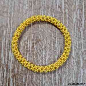✨ Bracelet artisanal népalais roll-on, crocheté à la main avec un fil de coton légèrement élastique et des perles de verre dorées.