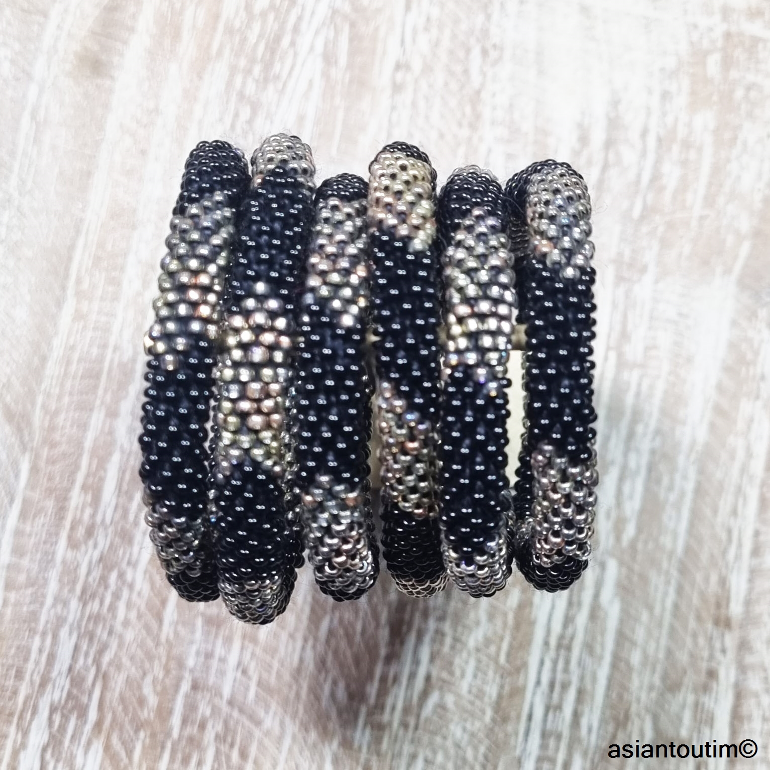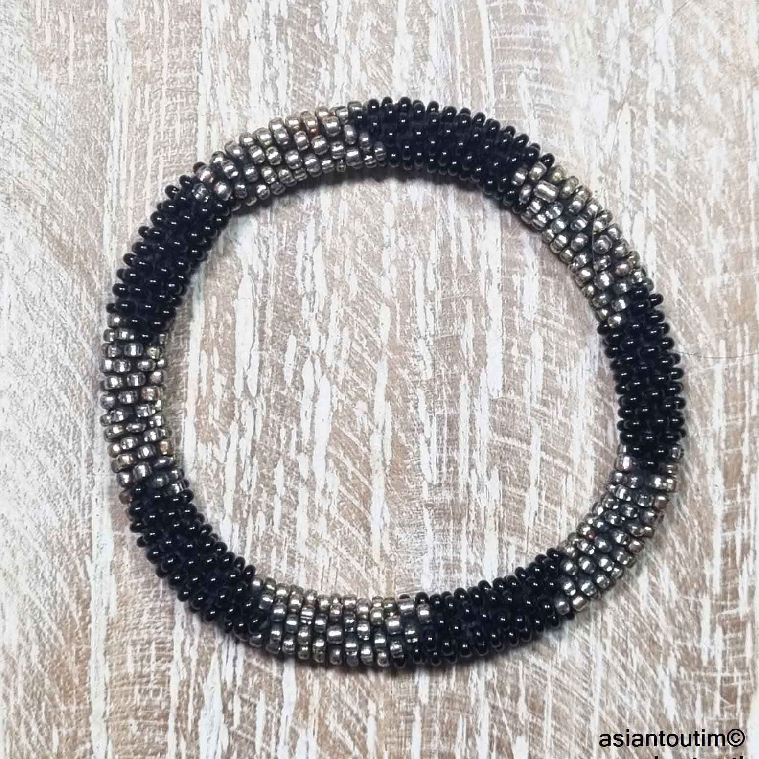 Bracelet népalais roll-on fait main, crocheté en fil de coton élastique et perles de verre.