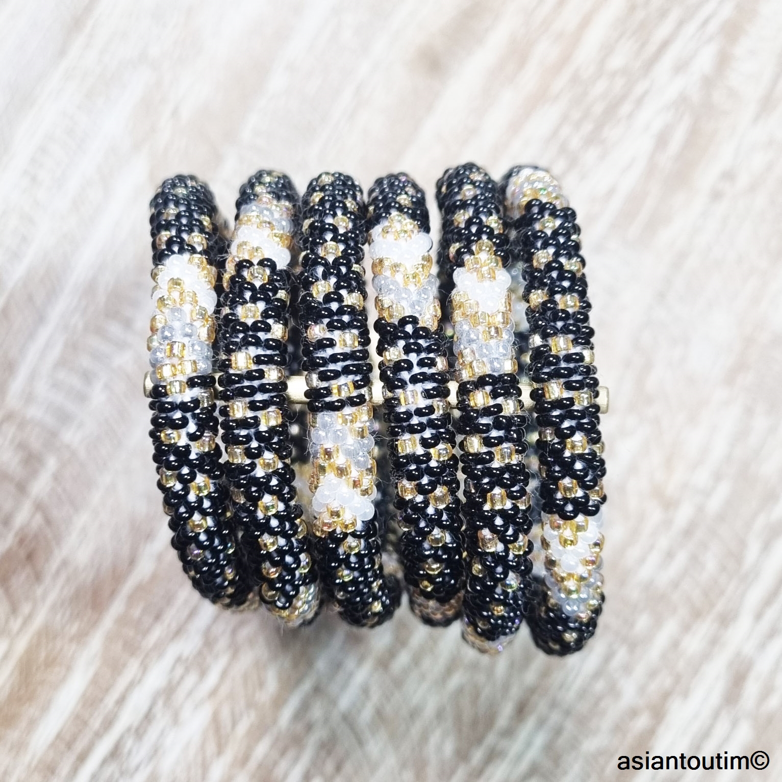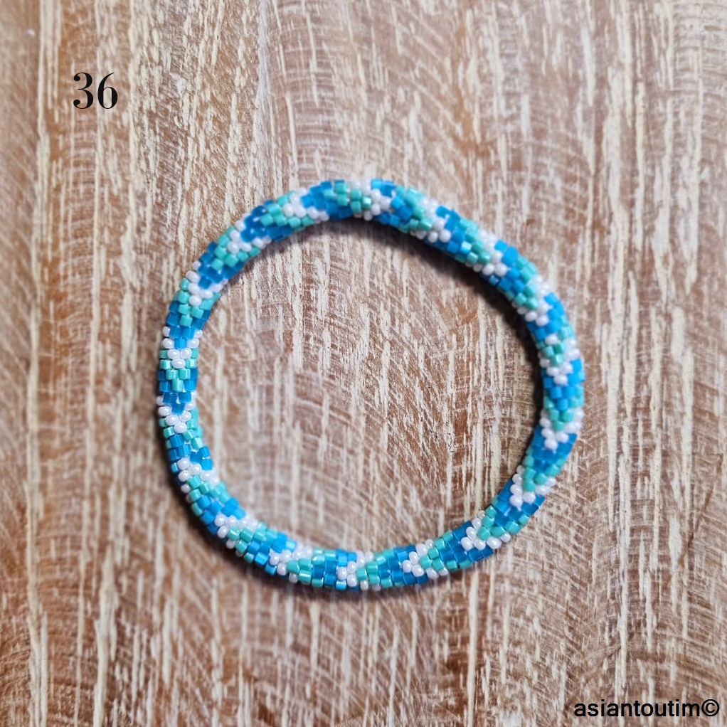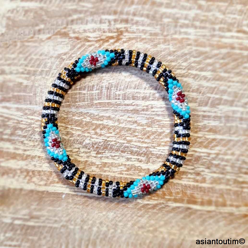 Bracelet népalais roll-on fait main, crocheté en fil de coton élastique et perles de verre.