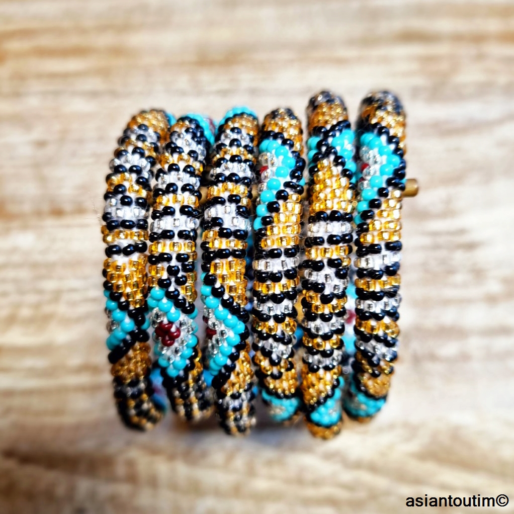✨ Bracelet artisanal népalais roll-on, crocheté à la main avec un fil de coton légèrement élastique et des perles de verre dorées.