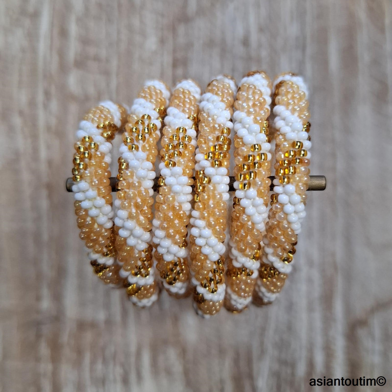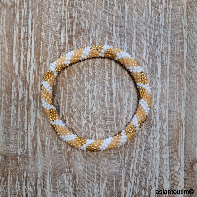 ✨ Bracelet artisanal népalais roll-on, crocheté à la main avec un fil de coton légèrement élastique et des perles de verre dorées.