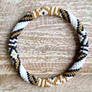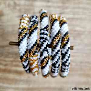 ✨ Bracelet artisanal népalais roll-on, crocheté à la main avec un fil de coton légèrement élastique et des perles de verre dorées.