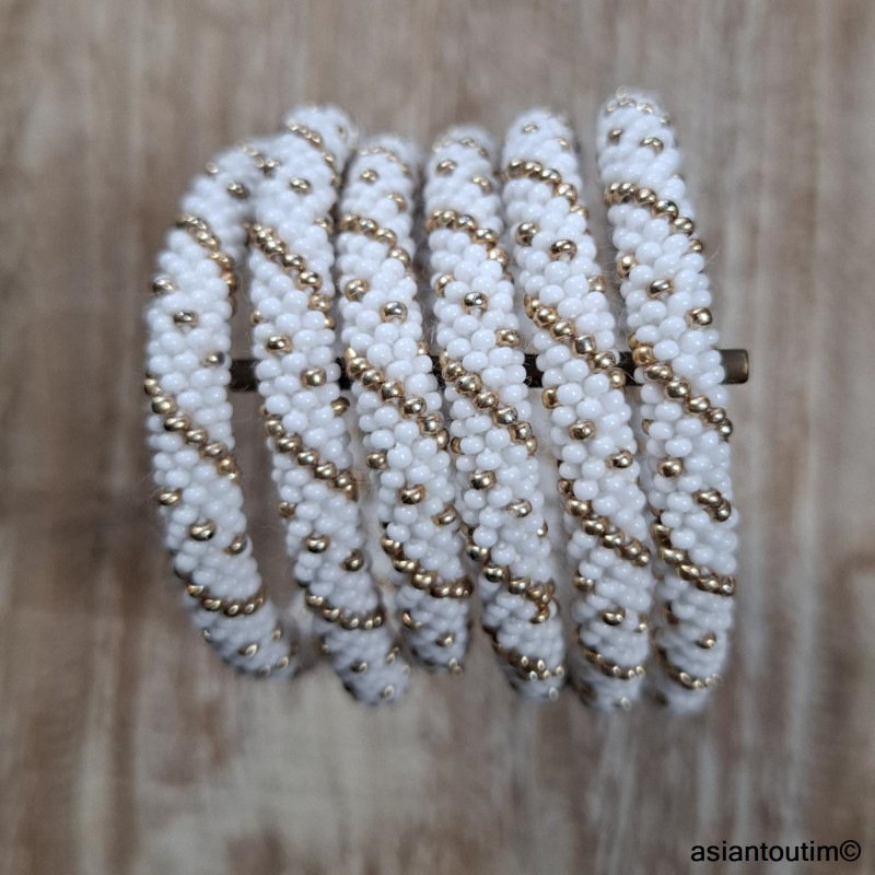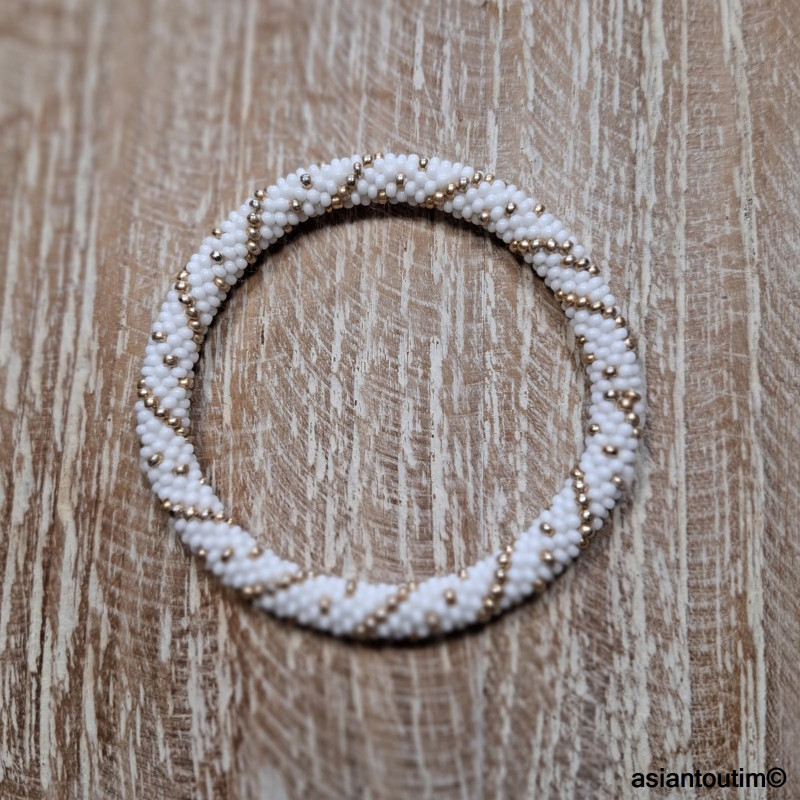 ✨ Bracelet artisanal népalais roll-on, crocheté à la main avec un fil de coton légèrement élastique et des perles de verre dorées.