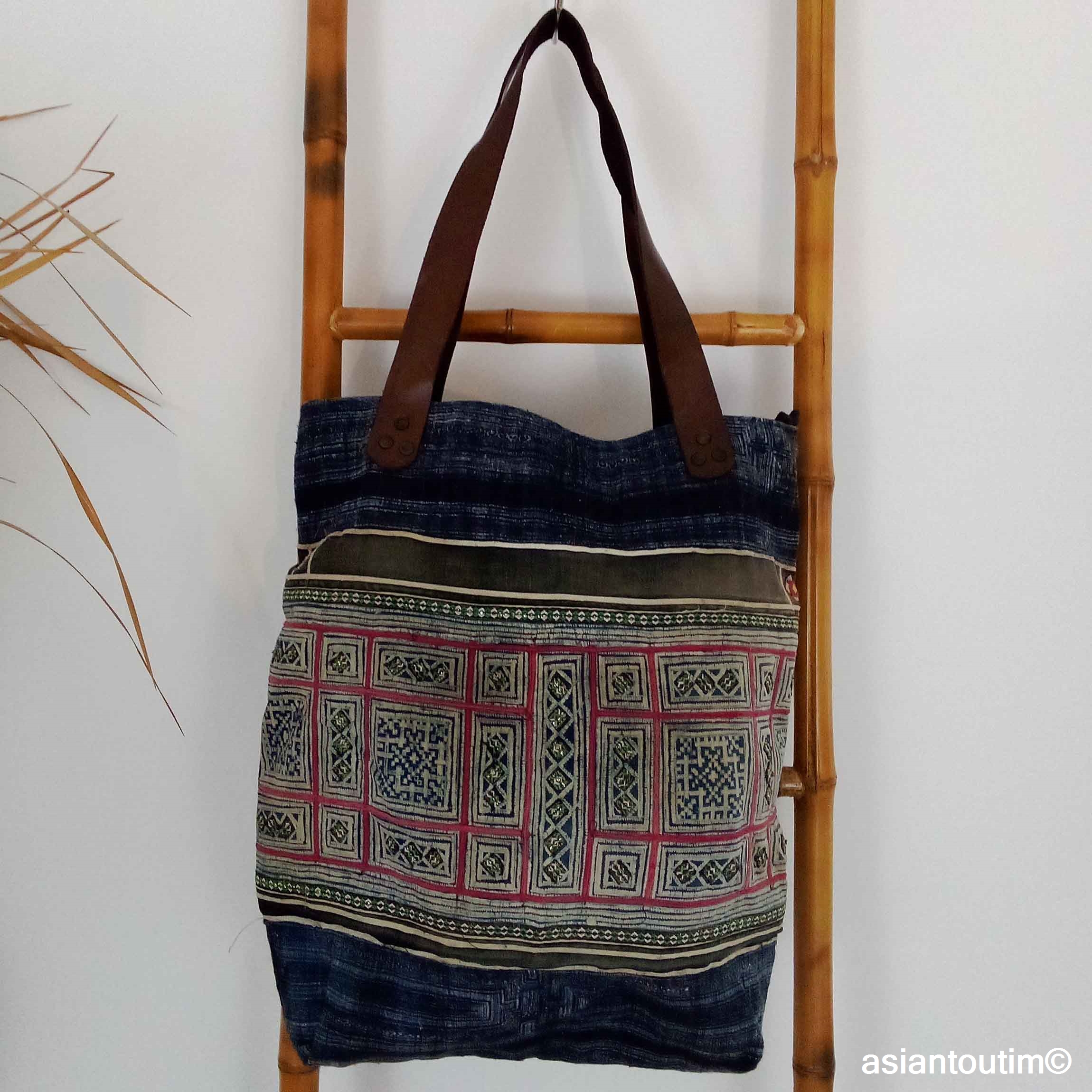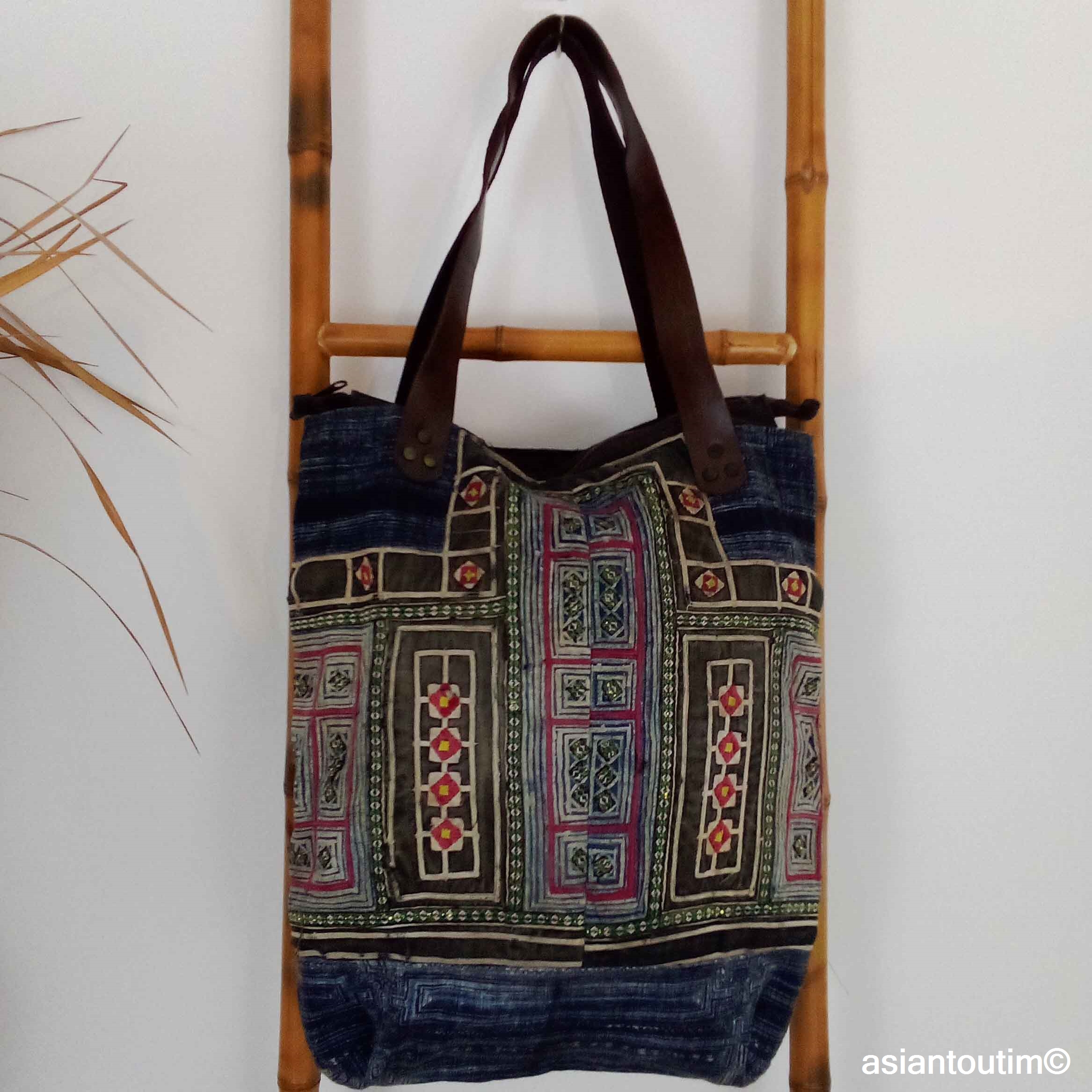 Sac ethnique Indigo Hmong en coton, pièce unique artisanale avec anses cuir et poches intérieures. Accessoire bohème chic authentique. Les tissus proviennent d’ethnies des montagnes du Nord Thaïlande et Vietnam les Hmong Bleu.