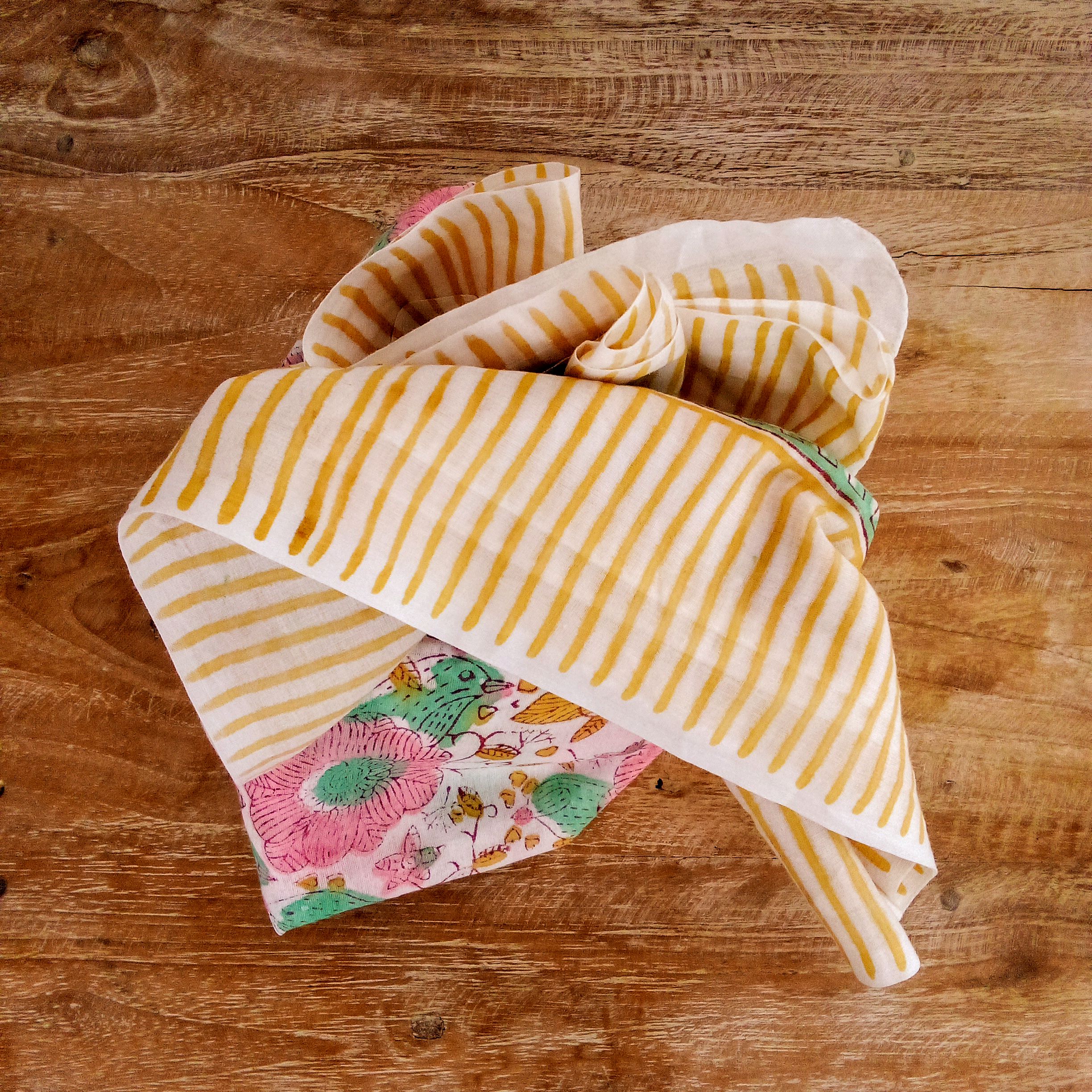 L’étole en coton au motif Sanganer 26.9 réalisée à la main au tampon de bois, technique d’impression indienne, vous suit partout été comme hiver.