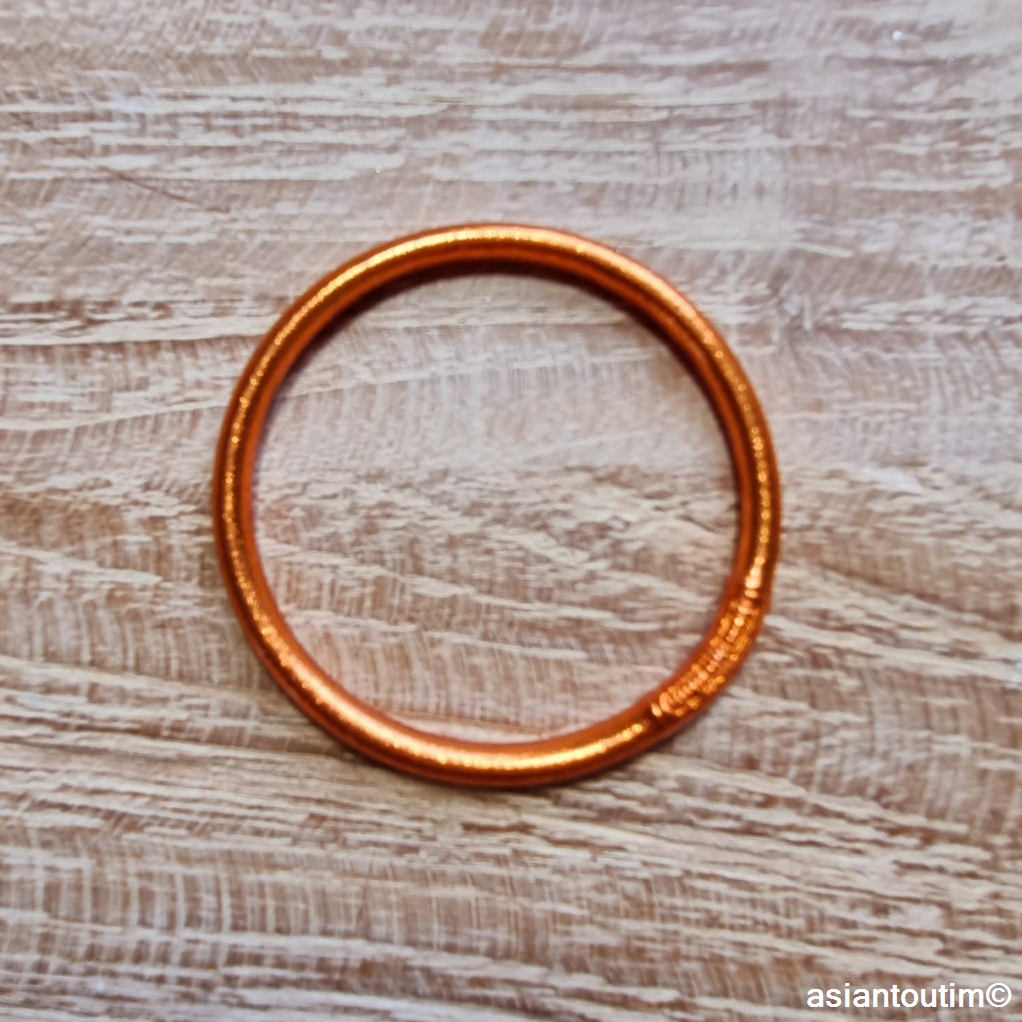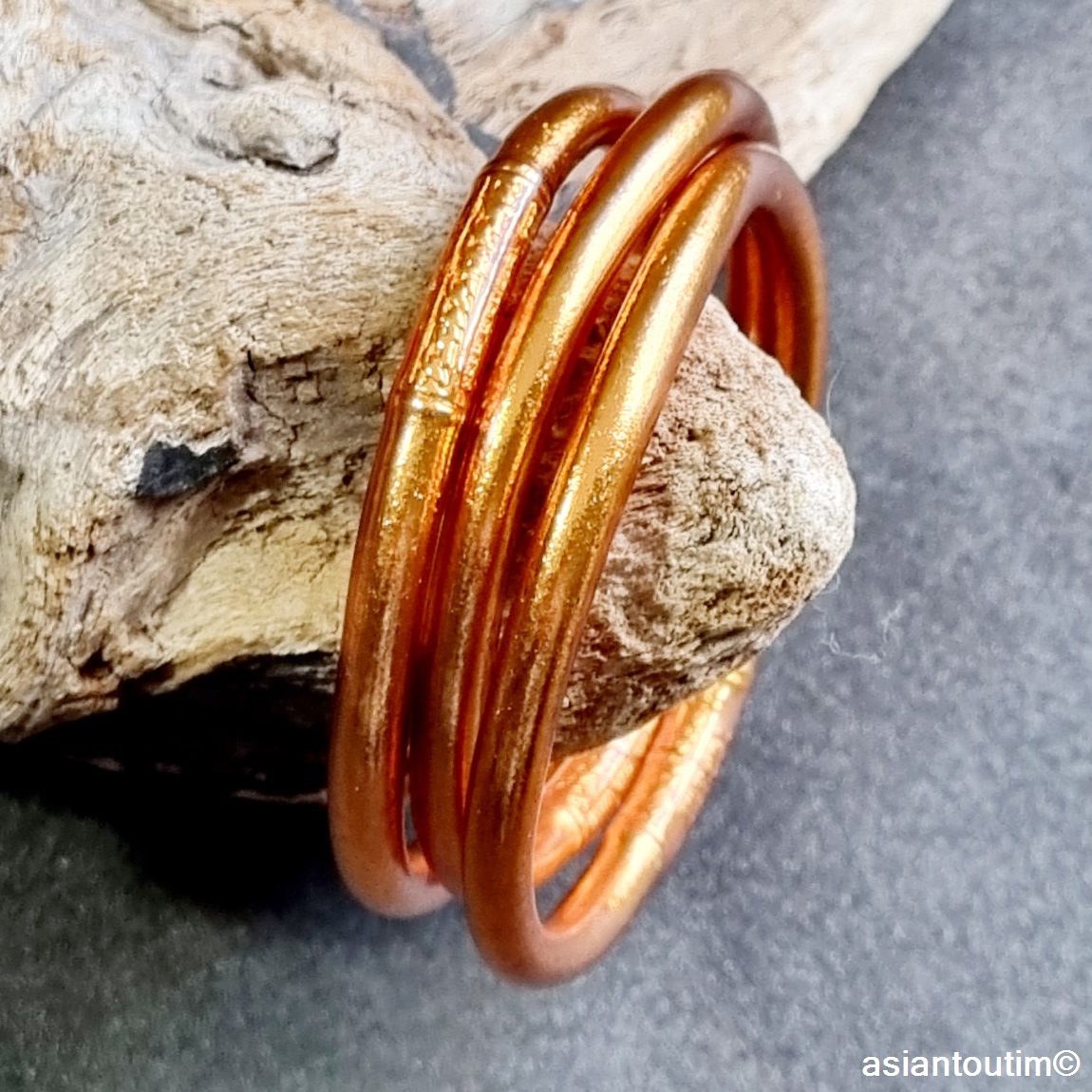 Un jonc bouddhiste cuivré, gravé d’un mantra de bonne fortune, fabriqué dans un temple en Thaïlande.
