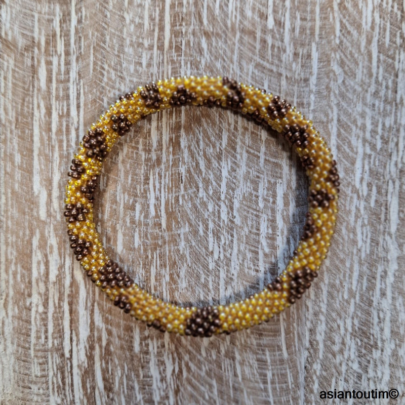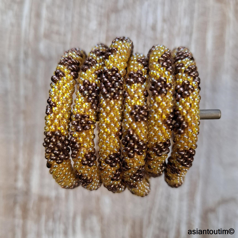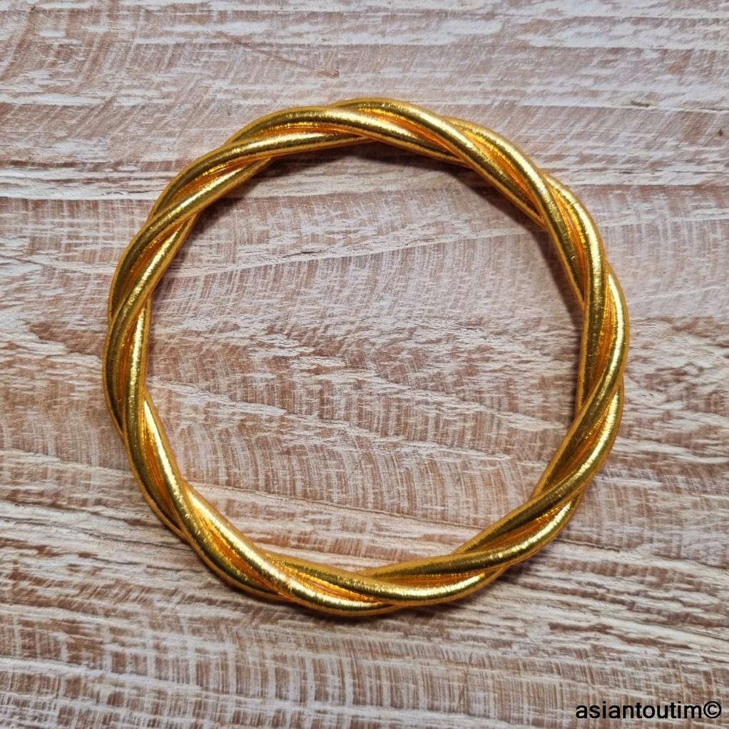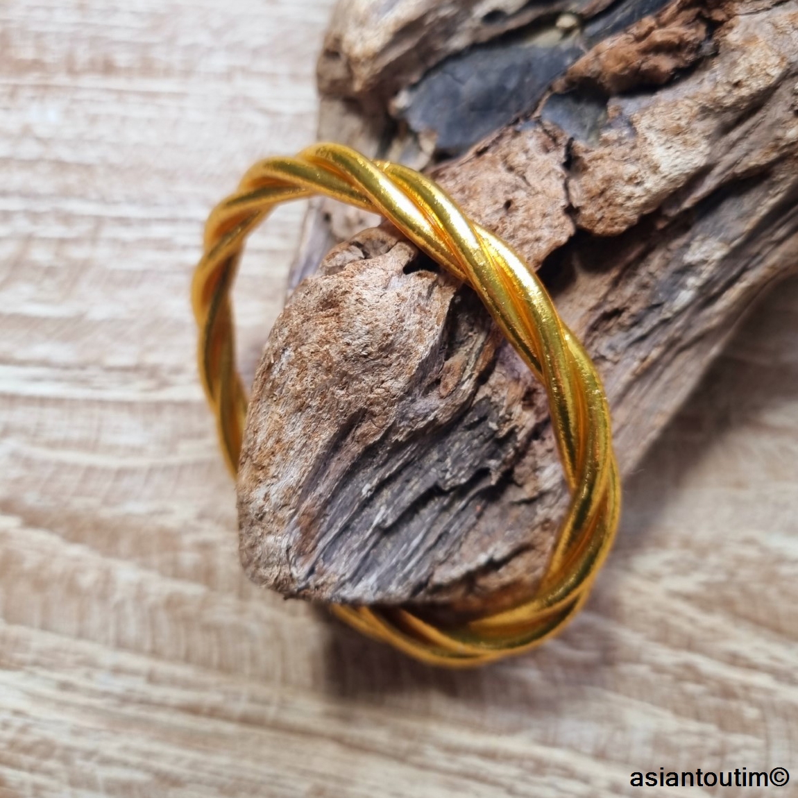 Un jonc double tressé bouddhiste doré porte-bonheur, fait main dans un temple. Un jonc souple en caoutchouc empli de feuilles doré utilisées par les bouddhistes pour le culte. Fermeture scellée non collée.