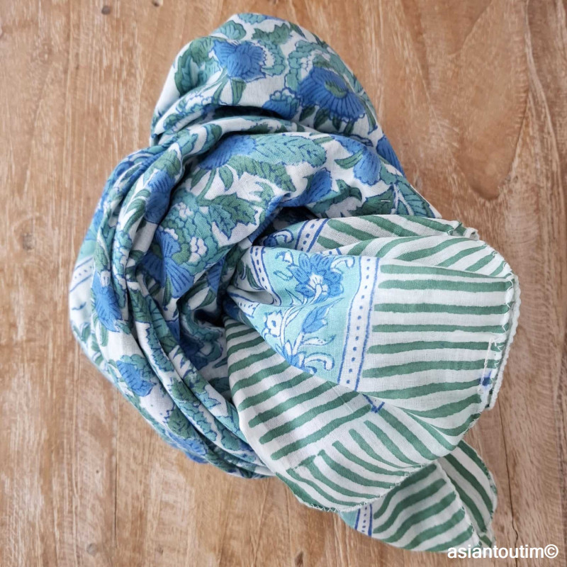 Confectionnée en 100% coton naturel, elle est imprimée à la main selon la technique ancestrale indienne du hand block (impression au tampon de bois). Chaque pièce est unique et peut présenter de légères irrégularités, véritables signatures de l’artisanat.