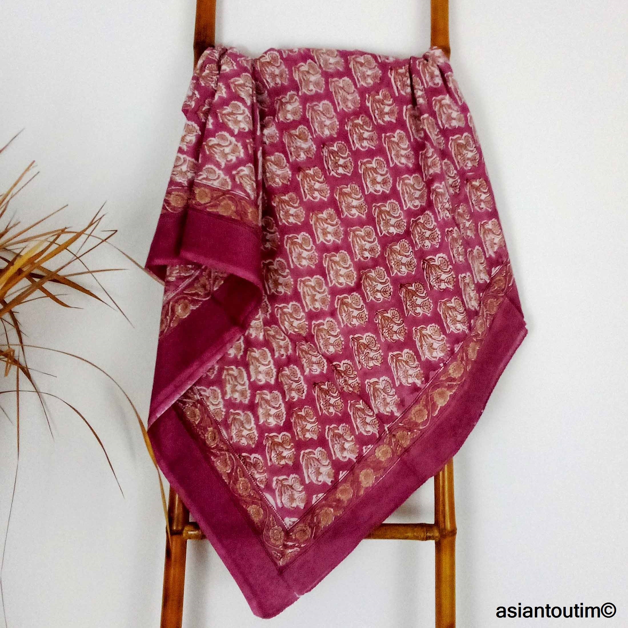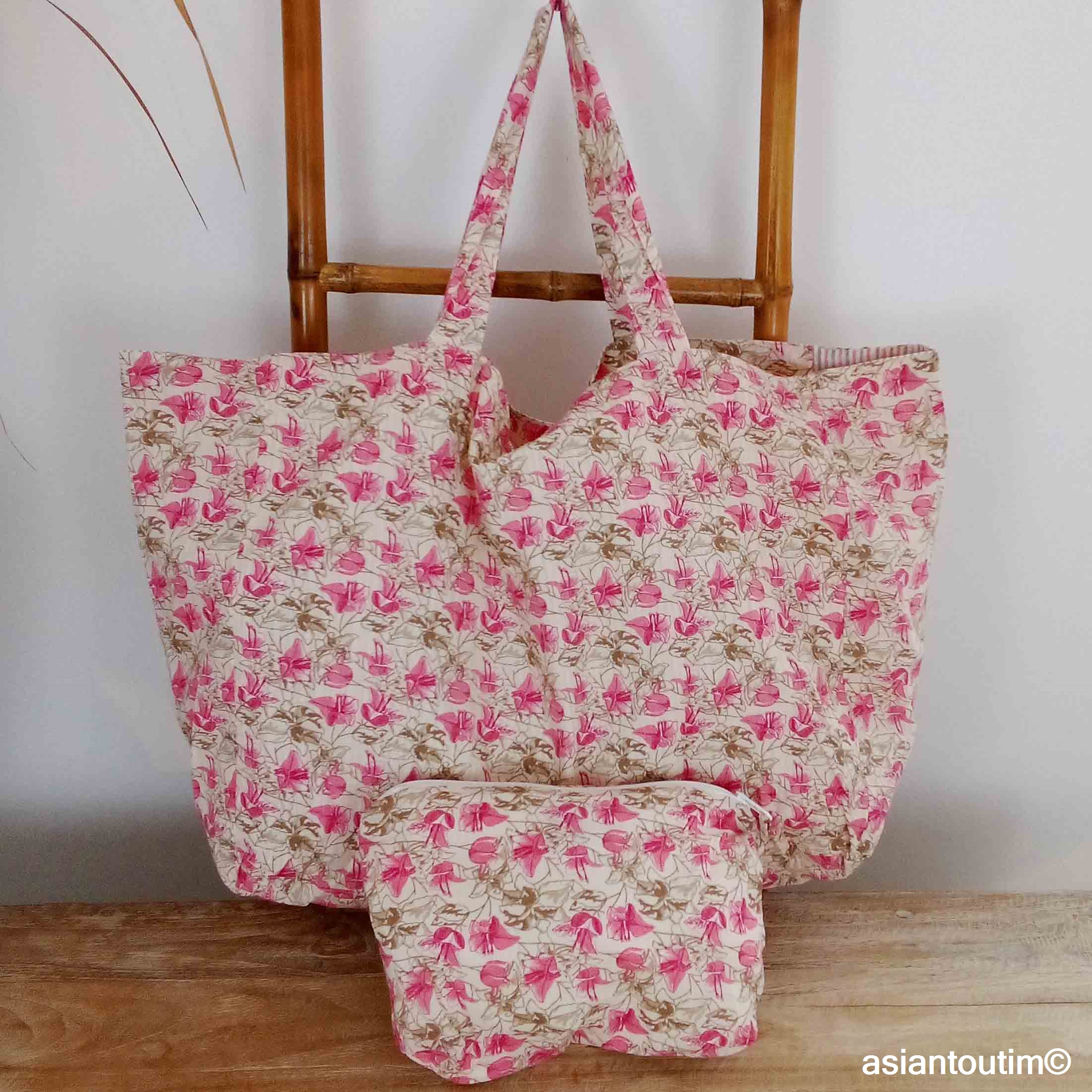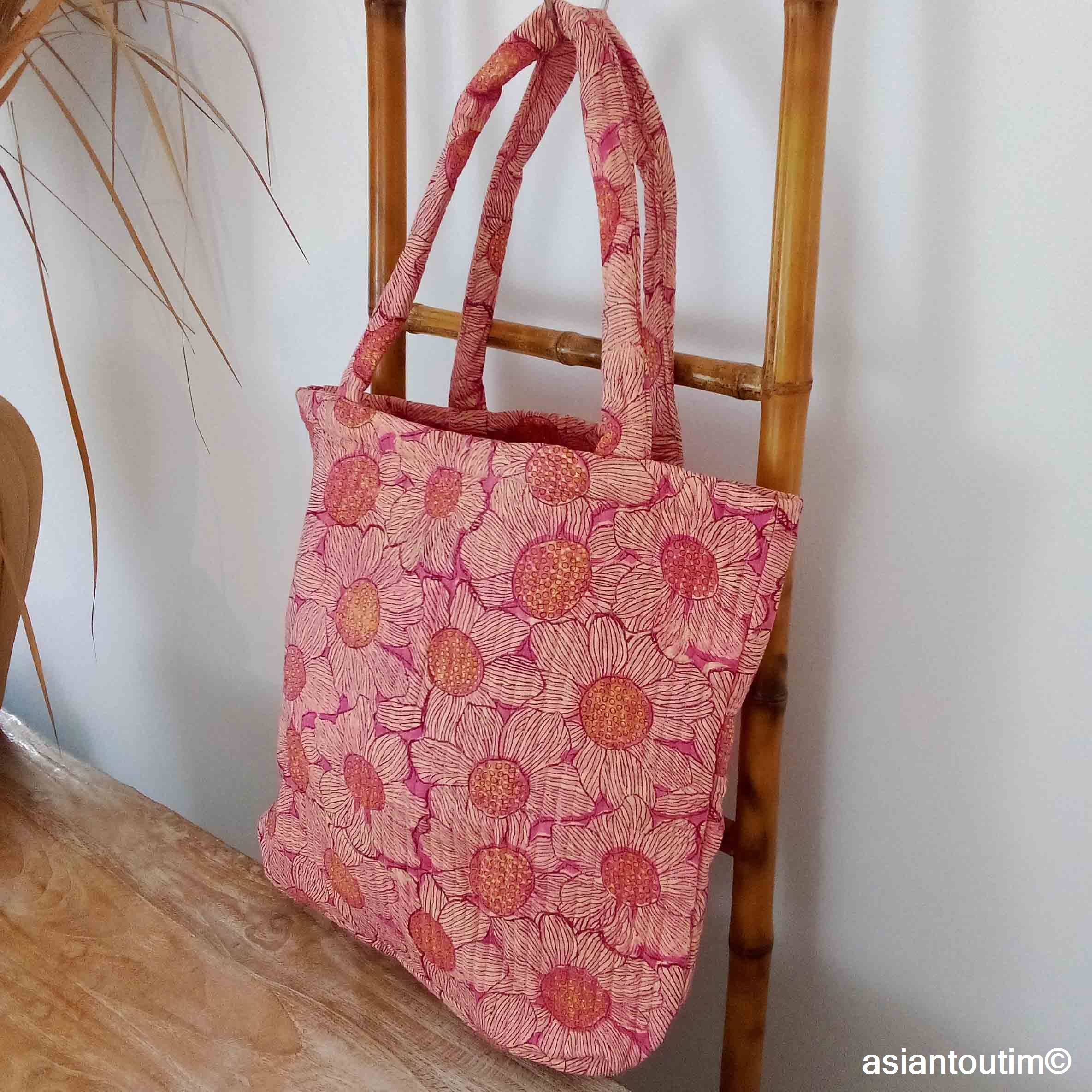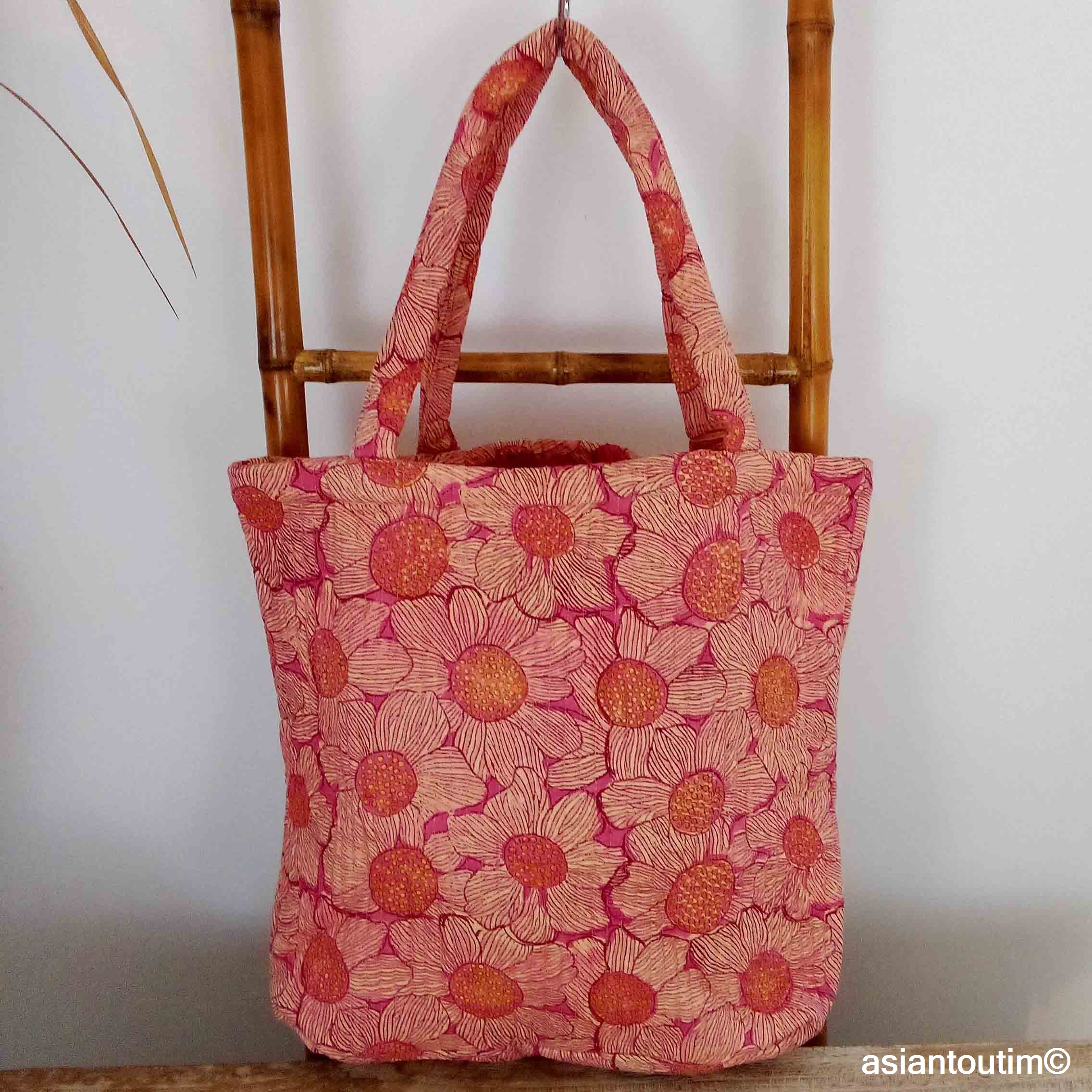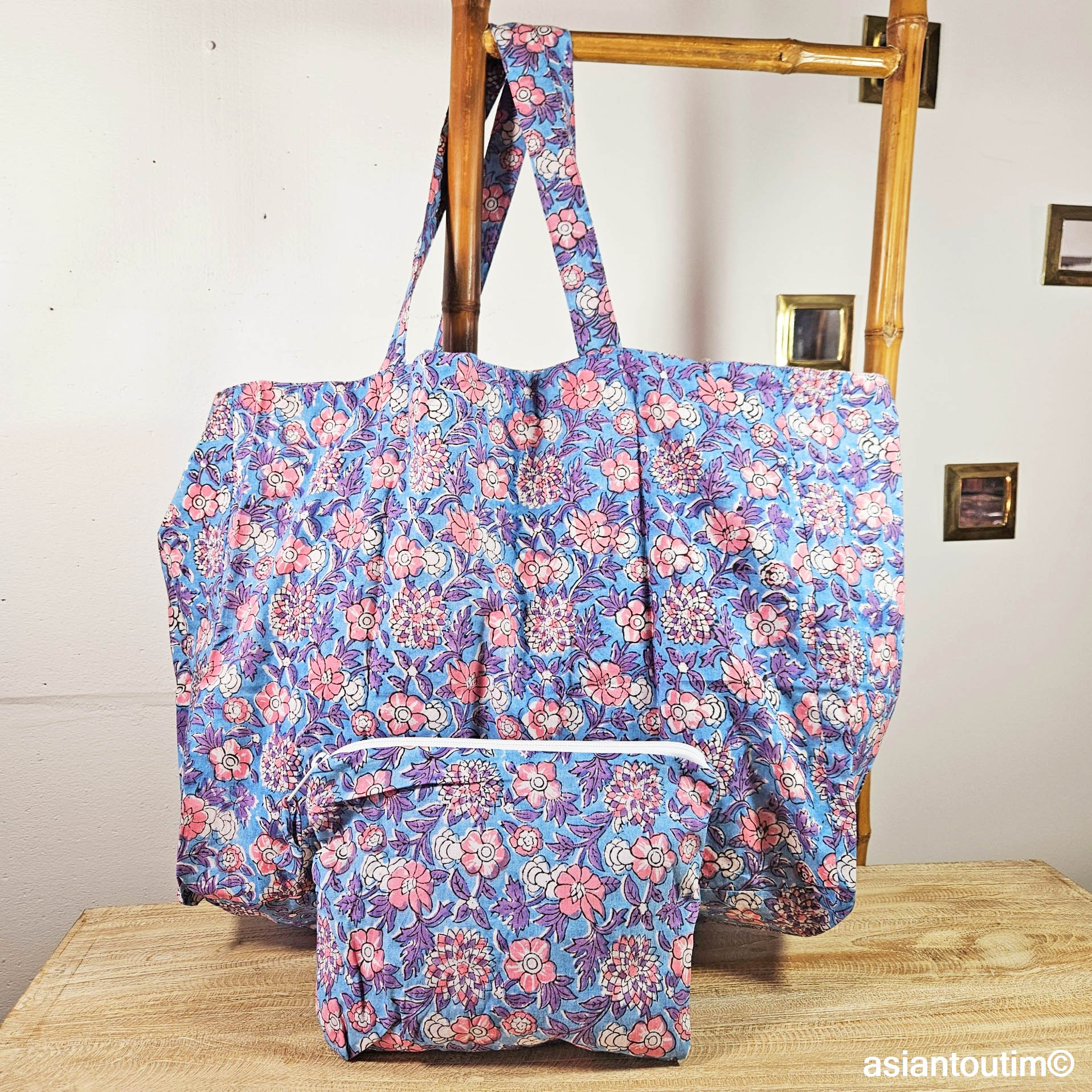 Confectionnée en coton floral, elle est doublée d’un tissu uni et imprimée à la main selon la technique ancestrale indienne du hand block print.