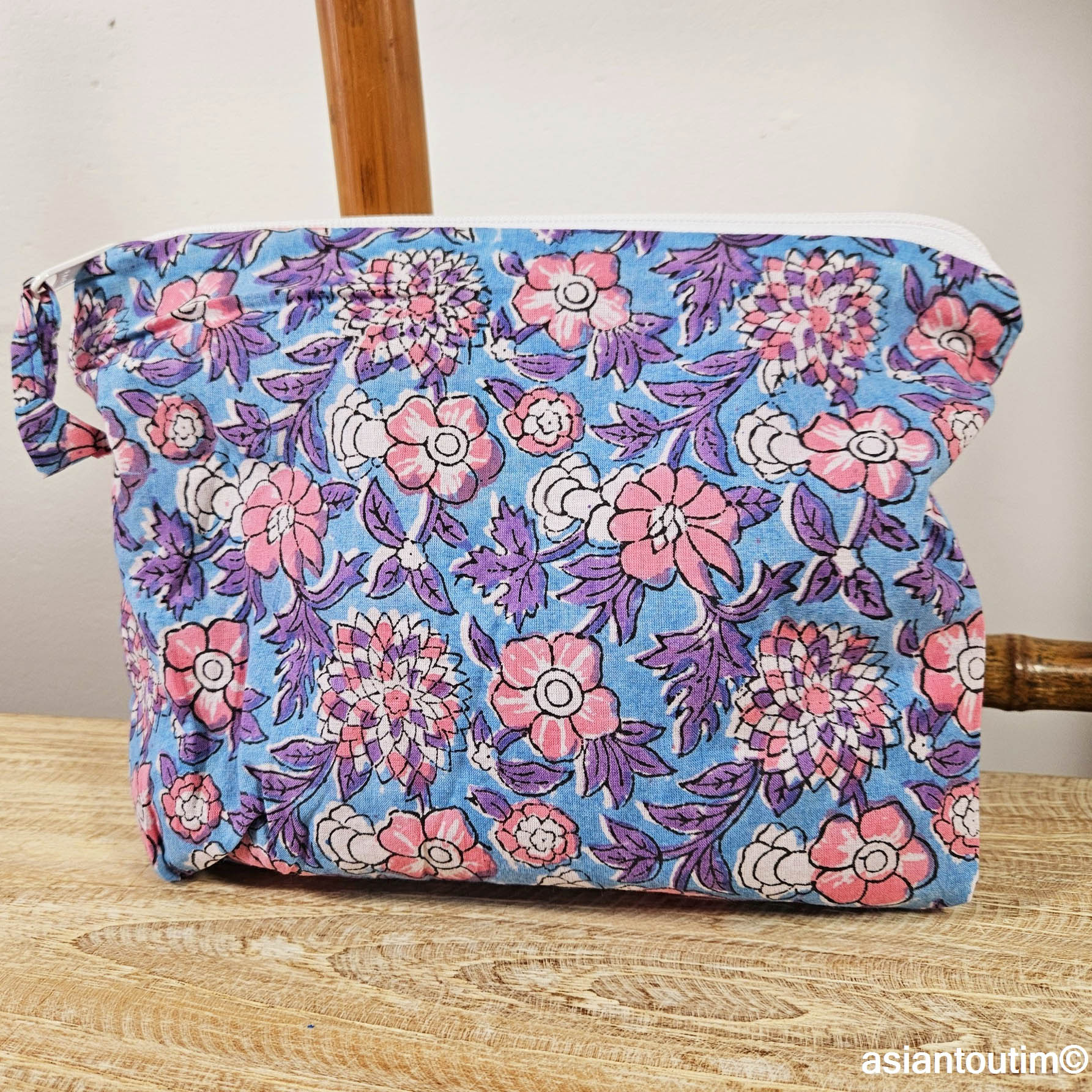 Pochette florale artisanale en coton, doublée, imprimée selon la technique indienne du hand block print. Chaque pièce est unique et révèle tout le charme de l’artisanat traditionnel. Parfaite pour ranger maquillage, accessoires ou petits essentiels du quotidien.
