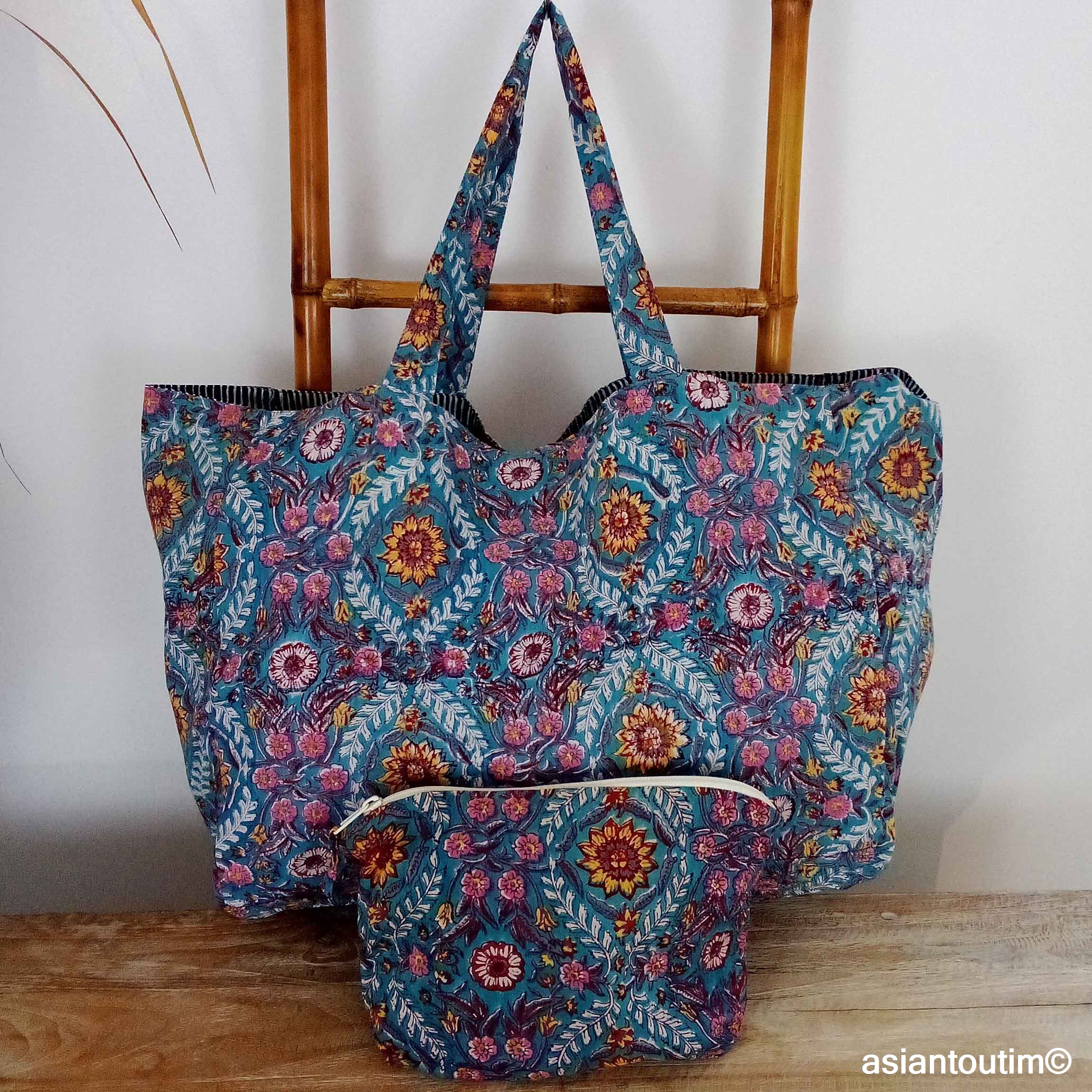 Confectionnée en coton floral, elle est doublée d’un tissu uni et imprimée à la main selon la technique ancestrale indienne du hand block print.