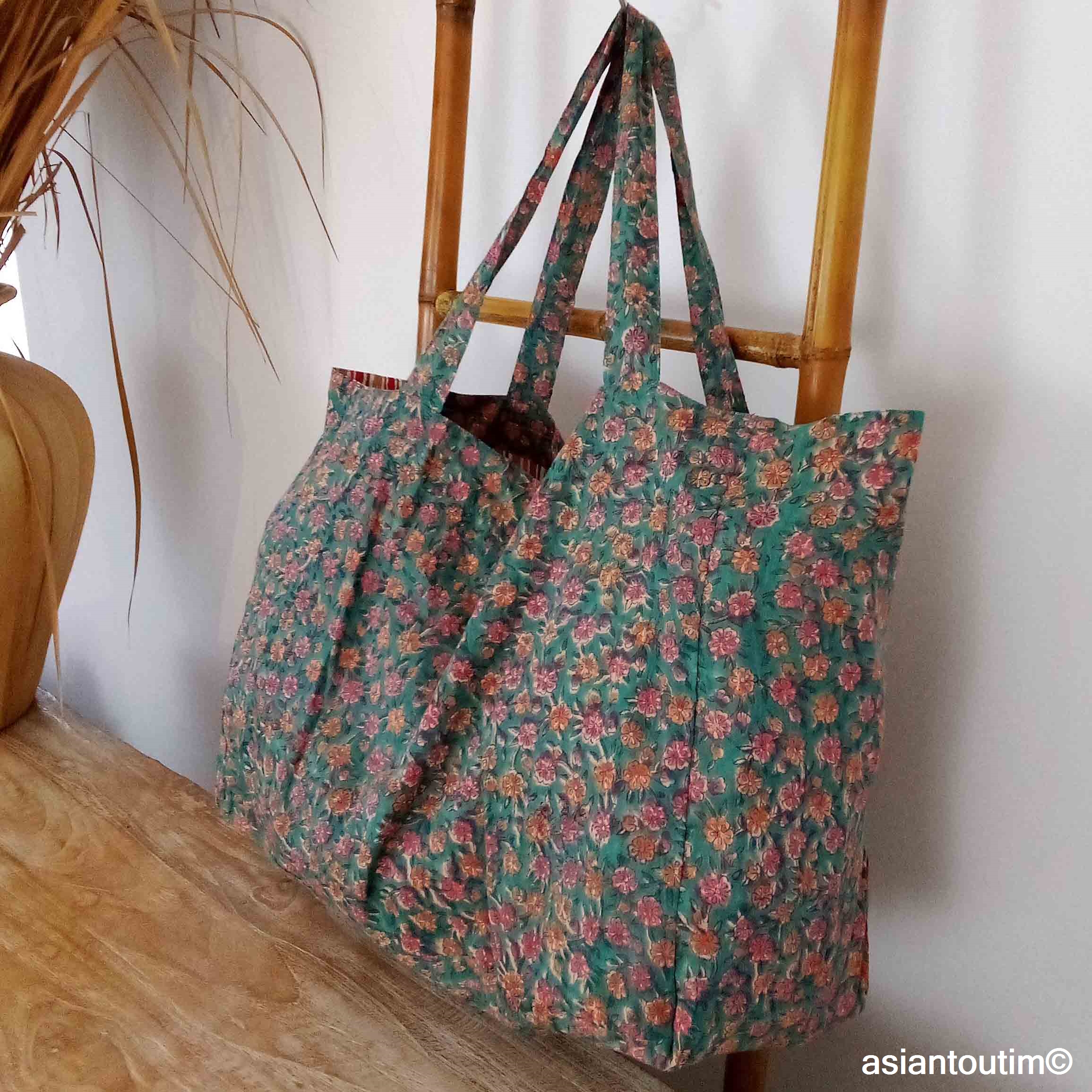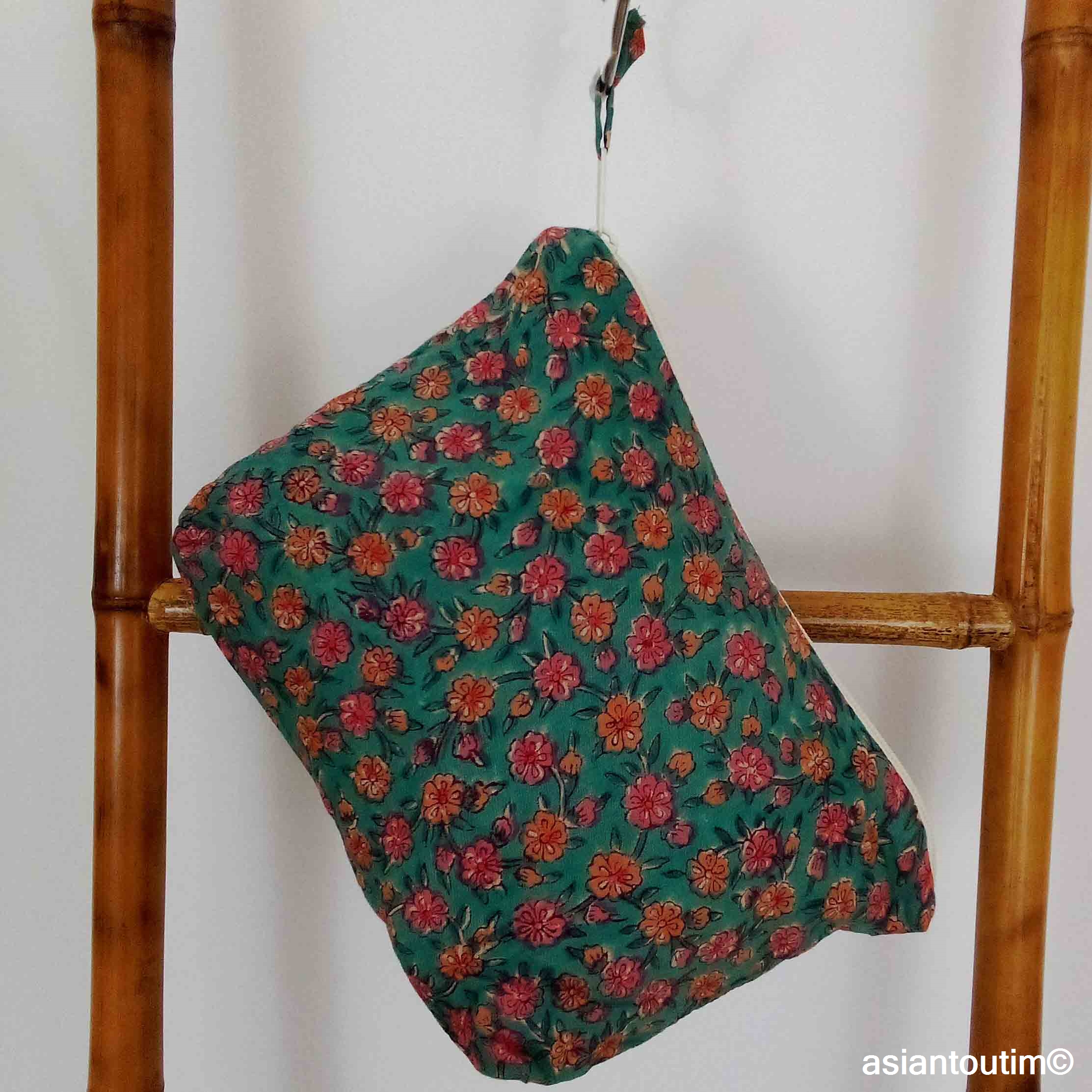 Confectionnée en coton floral, elle est doublée d’un tissu uni et imprimée à la main selon la technique ancestrale indienne du hand block print.