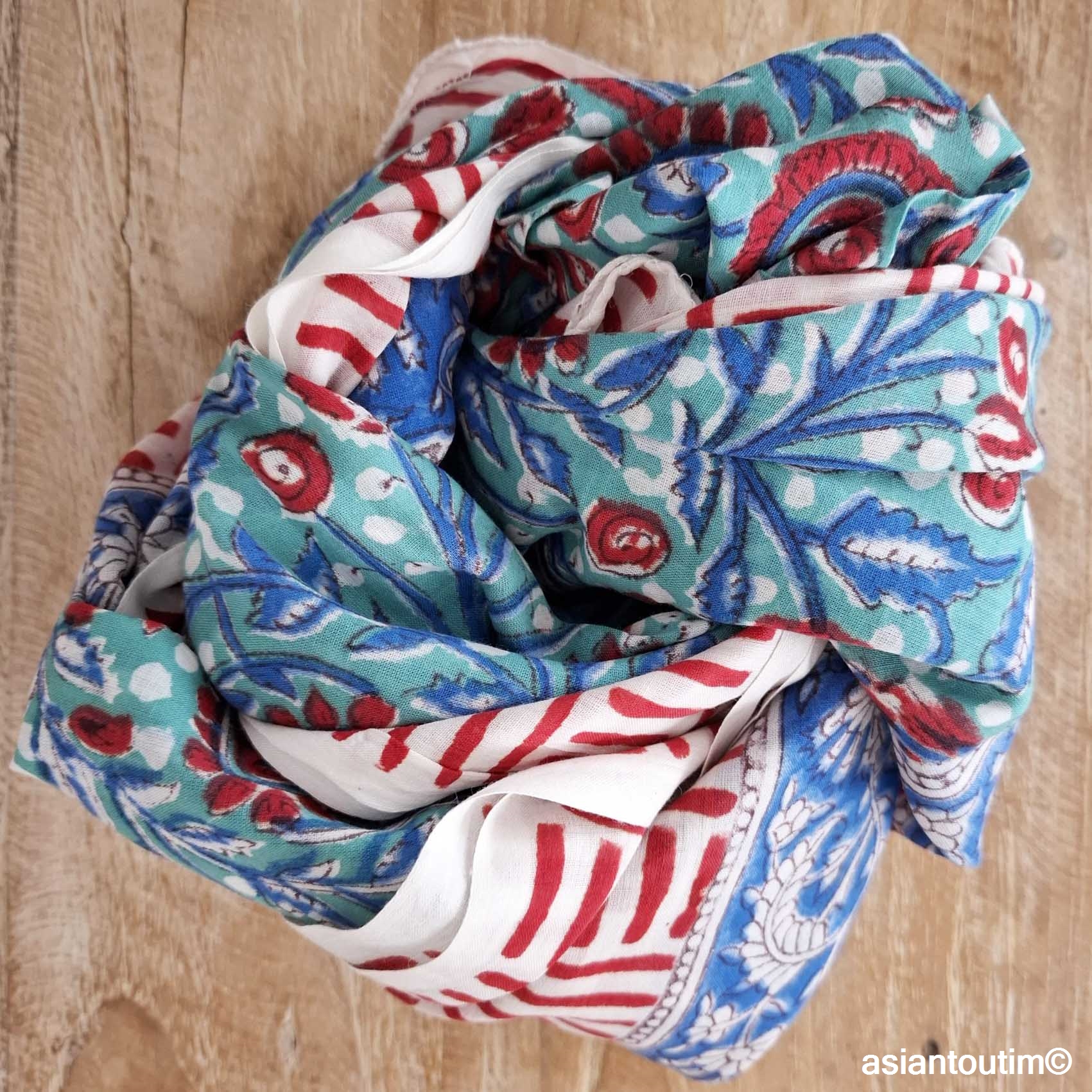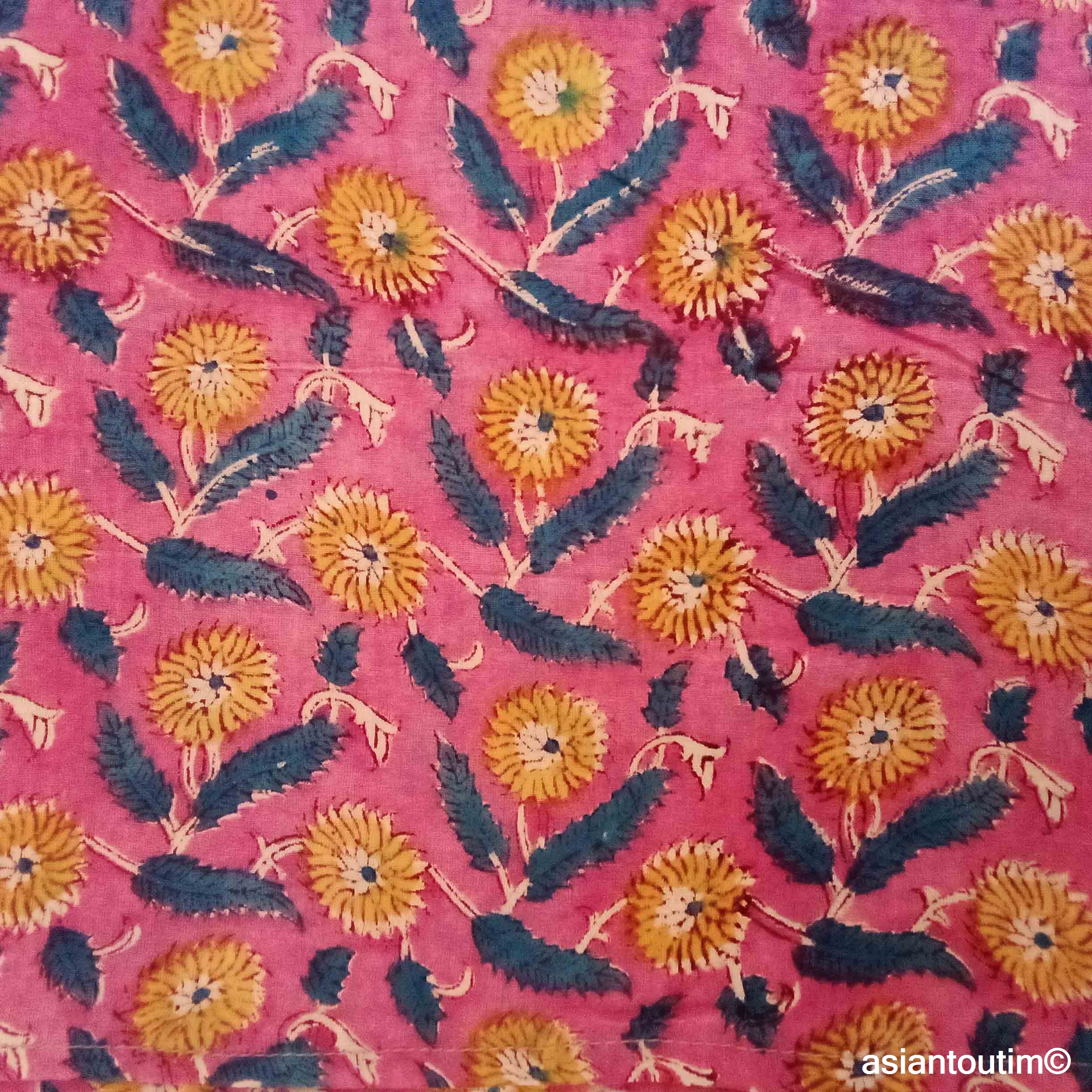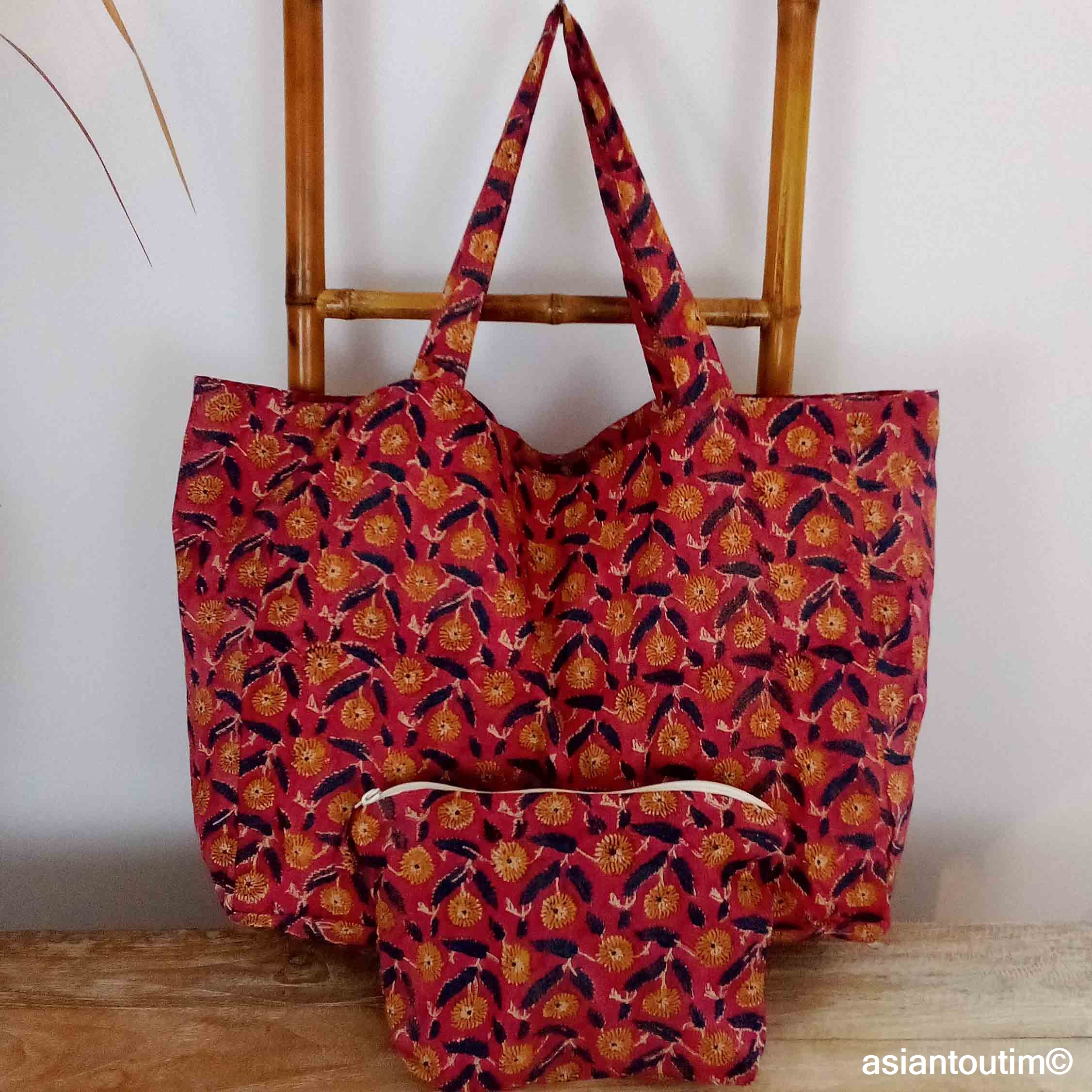 Confectionnée en coton floral, elle est doublée d’un tissu uni et imprimée à la main selon la technique ancestrale indienne du hand block print.