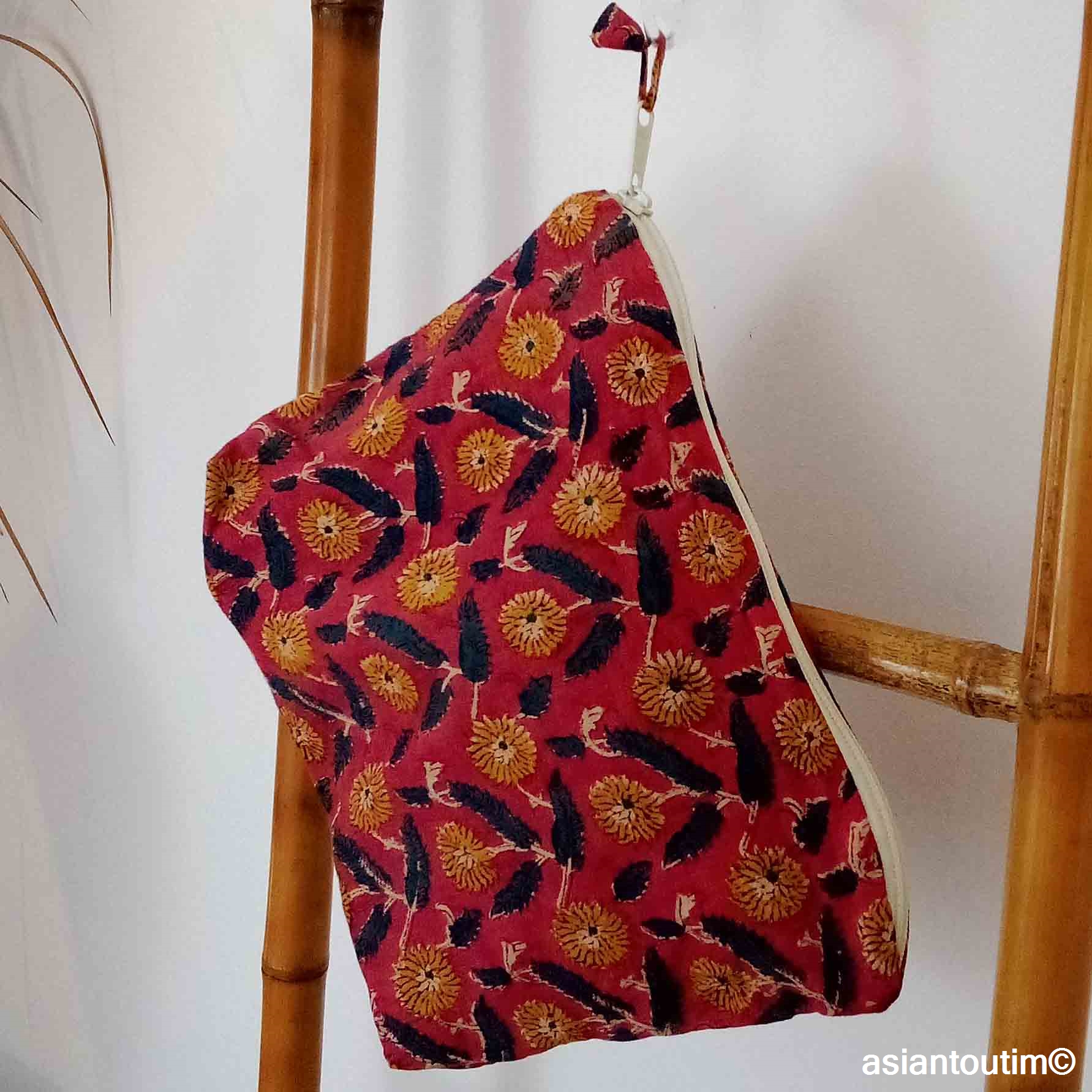 Pochette florale artisanale en coton, doublée, imprimée selon la technique indienne du hand block print. Chaque pièce est unique et révèle tout le charme de l’artisanat traditionnel. Parfaite pour ranger maquillage, accessoires ou petits essentiels du quotidien.