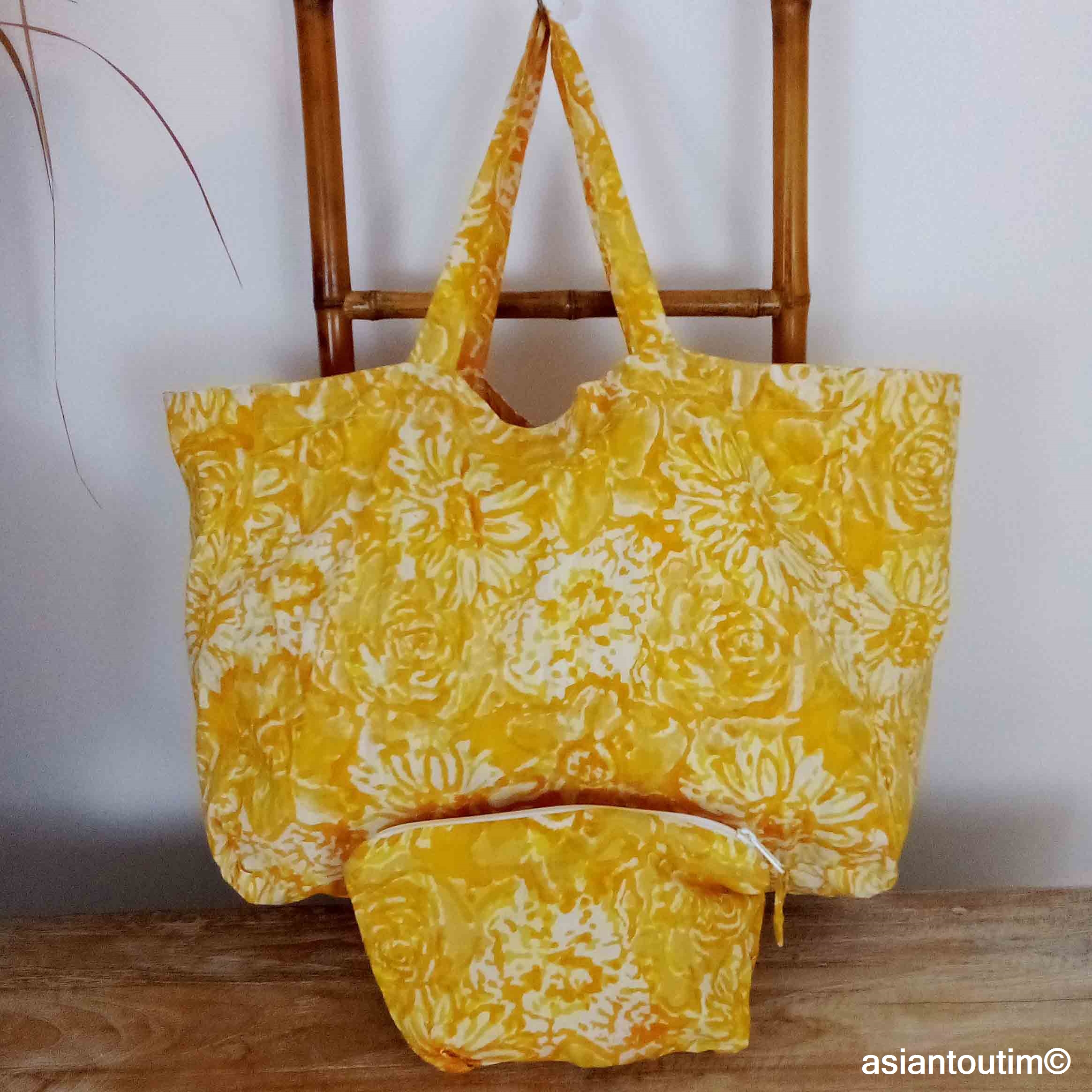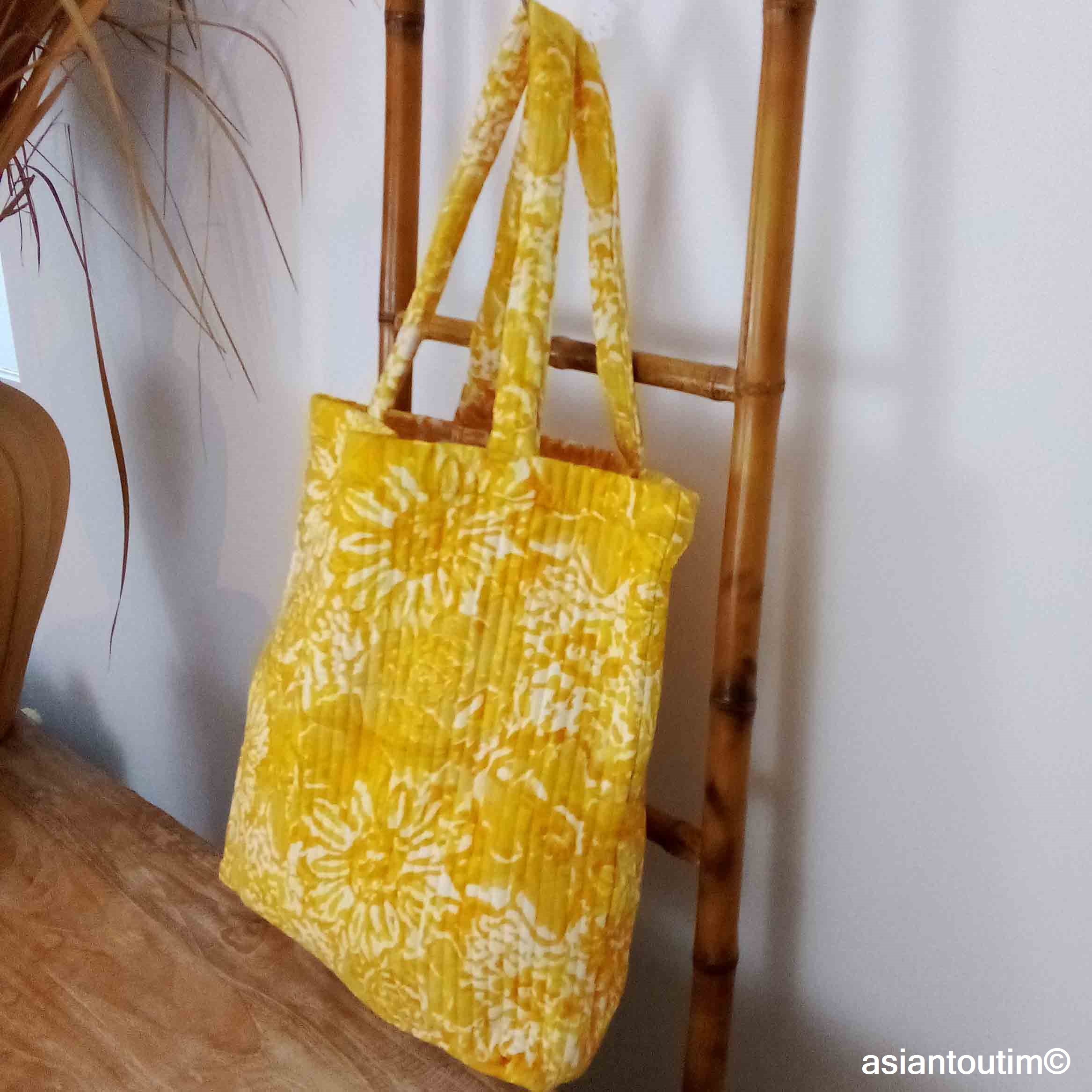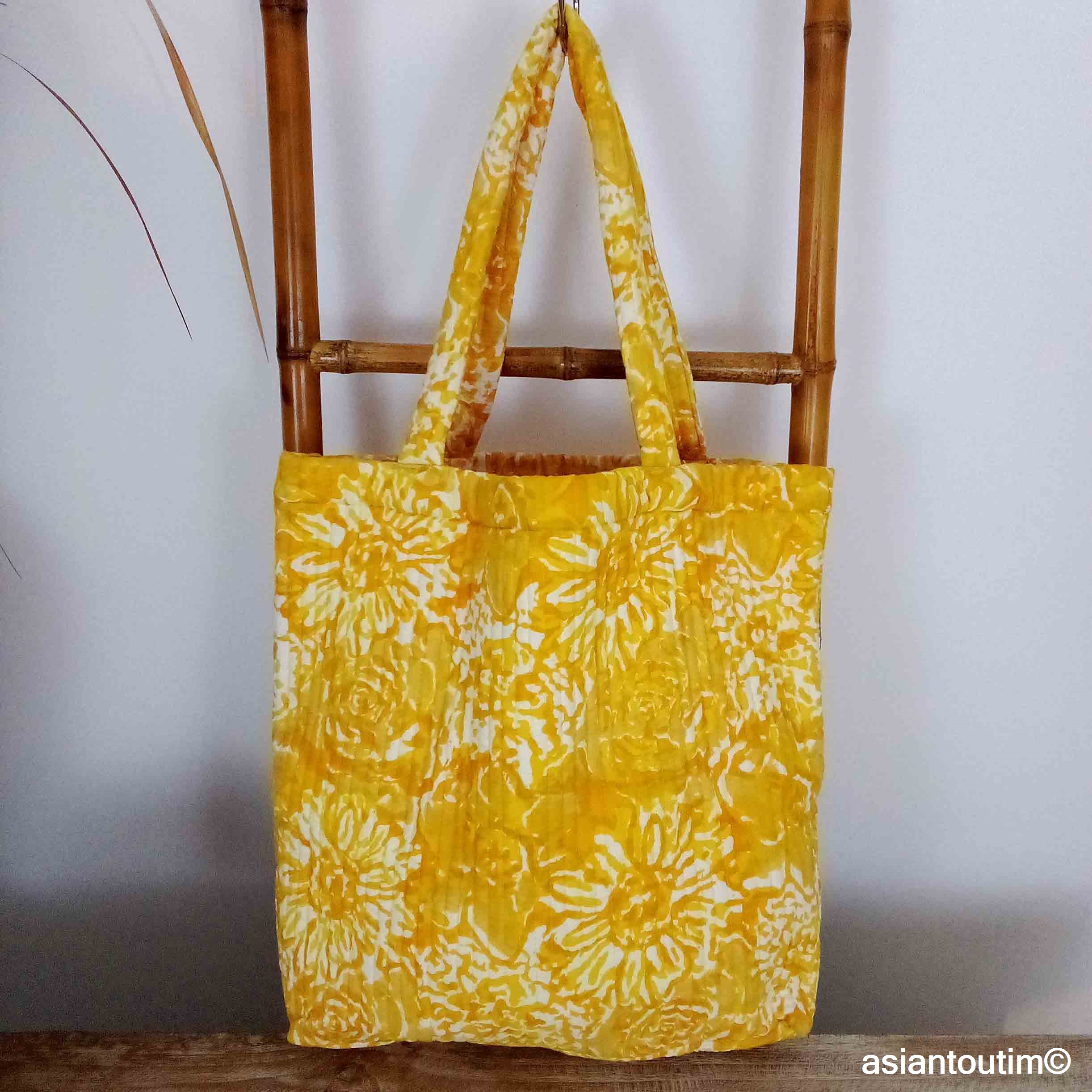 Confectionnée en coton floral, elle est doublée d’un tissu uni et imprimée à la main selon la technique ancestrale indienne du hand block print.