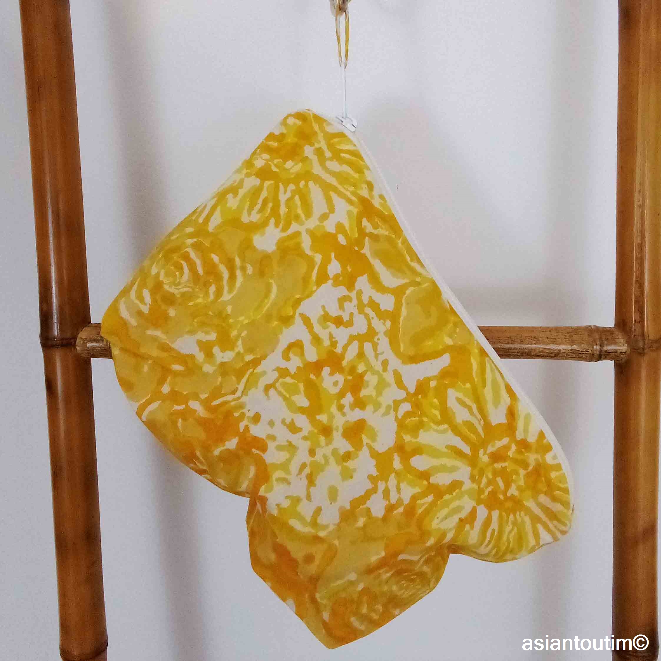 Chaque motif est réalisé par un artisan à l’aide d’un tampon en bois sculpté, appliqué avec minutie sur le coton tendu. Chaque couleur nécessite un passage distinct, rendant chaque pochette unique. Les légères irrégularités de l’imprimé témoignent d’un travail artisanal authentique, réalisé avec amour et patience.