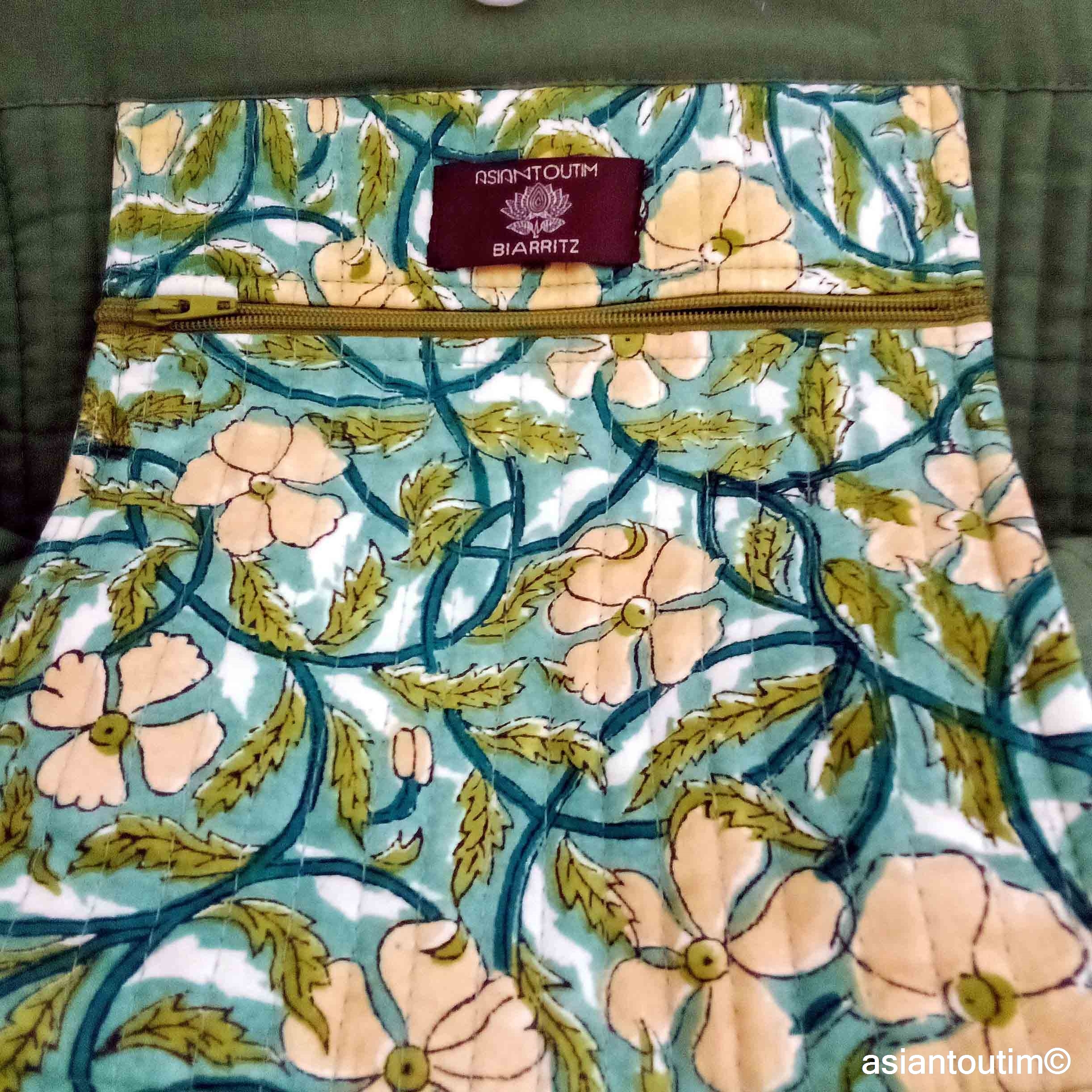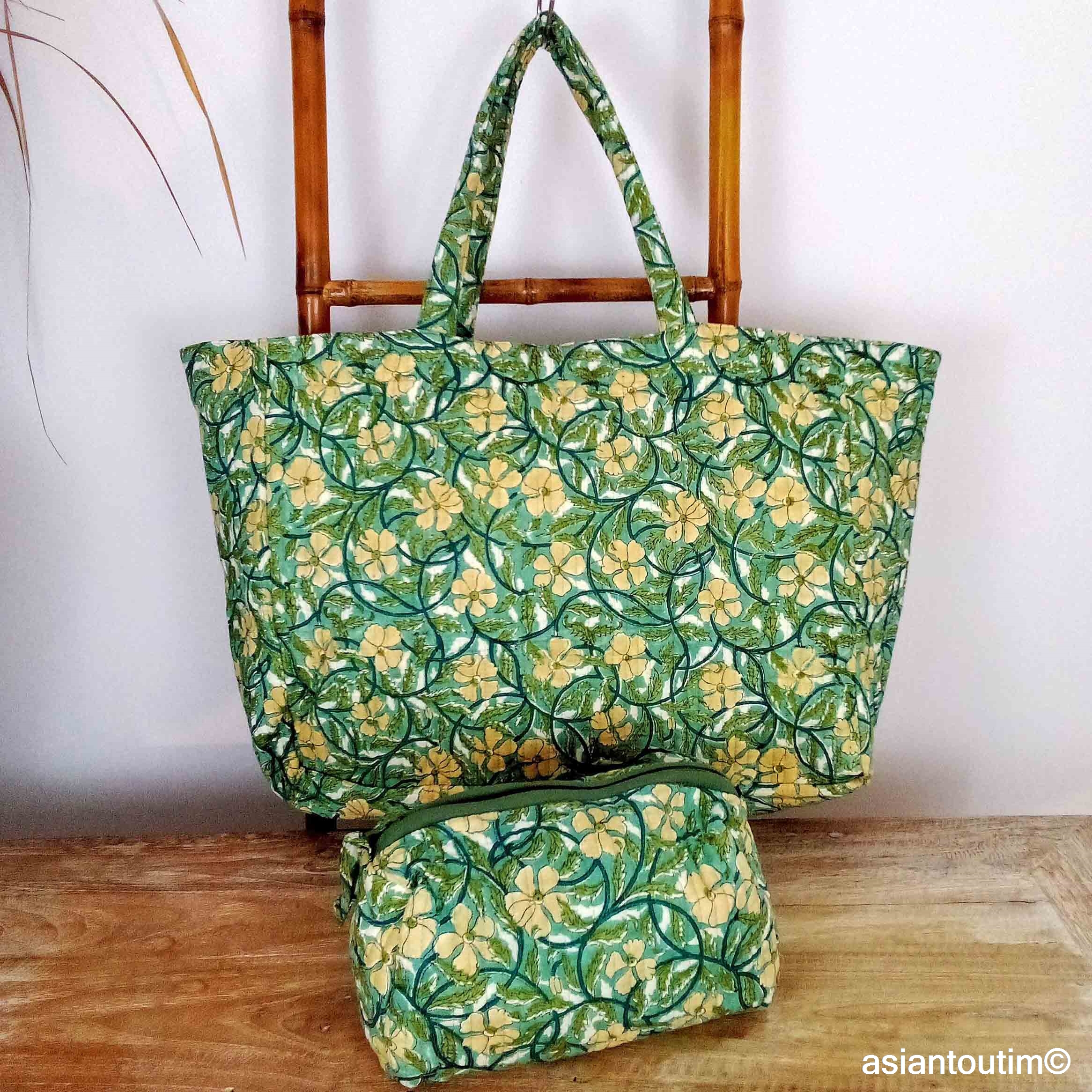 Grand cabas à shopper matelassé en coton, coloris Agathe, imprimé à la main en Inde, motif Sanganer. Léger, spacieux et pratique, il est idéal pour l’été : plage, ville, sport ou escapades du quotidien.