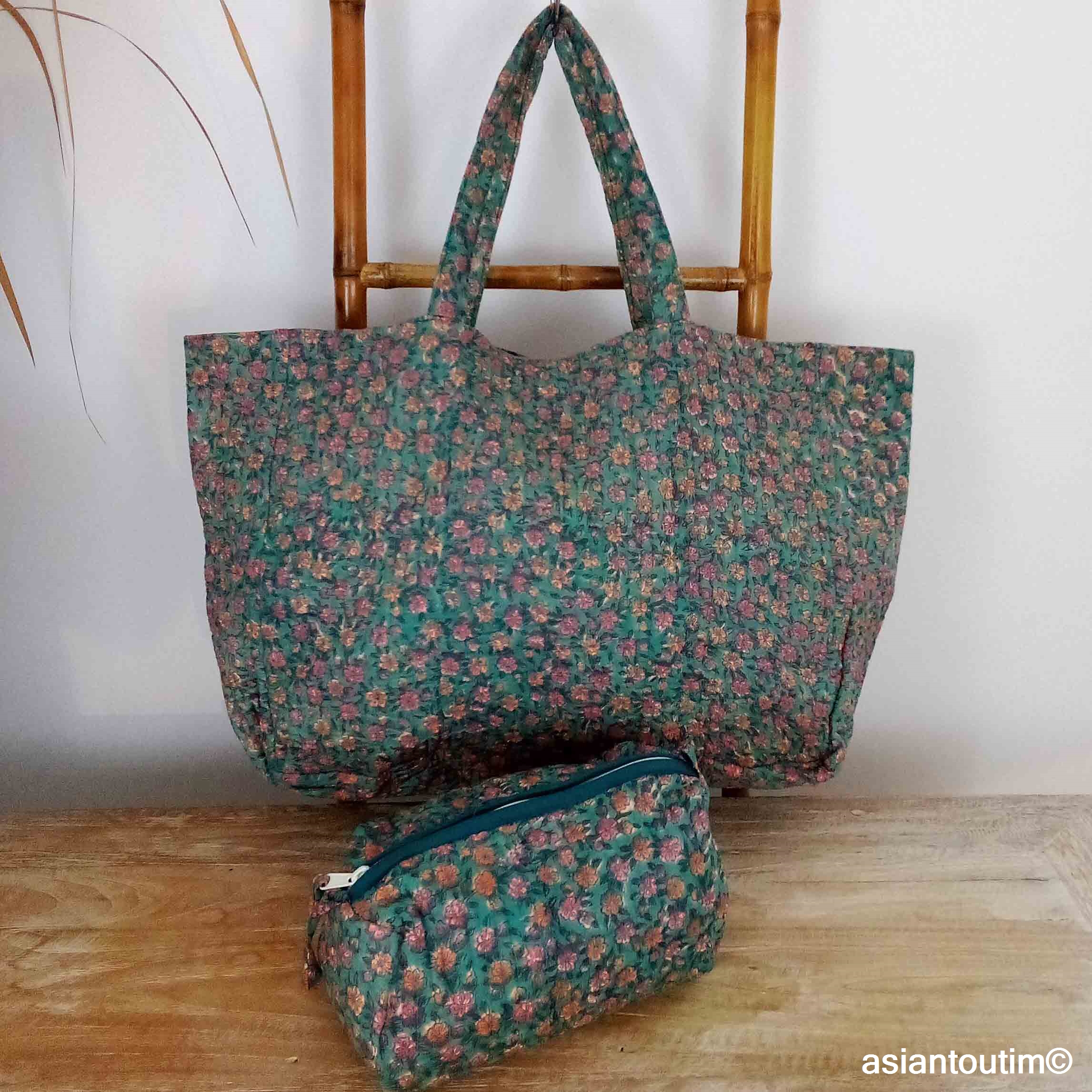 Grand cabas à shopper matelassé en coton, coloris June, imprimé à la main en Inde, motif Sanganer. Léger, spacieux et pratique, il est idéal pour l’été : plage, ville, sport ou escapades du quotidien.