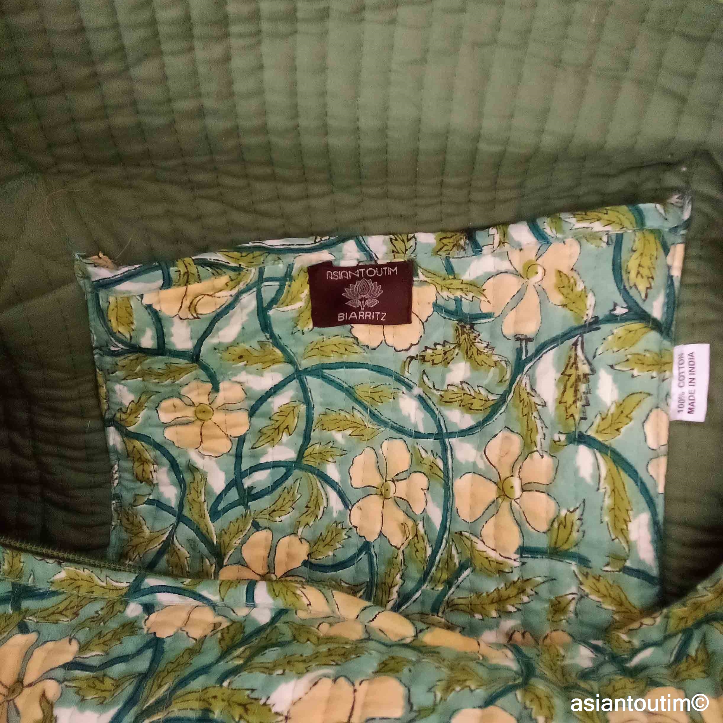 Réalisé en coton imprimé à la main, ce sac met en valeur le savoir-faire artisanal indien grâce à la technique traditionnelle du hand block print. Matelassé et entièrement zippé, il dispose d’une poche intérieure et d’une poche extérieure pour une organisation optimale. Chaque pièce est fabriquée en toute petite série, rendant chaque sac unique ou presque.