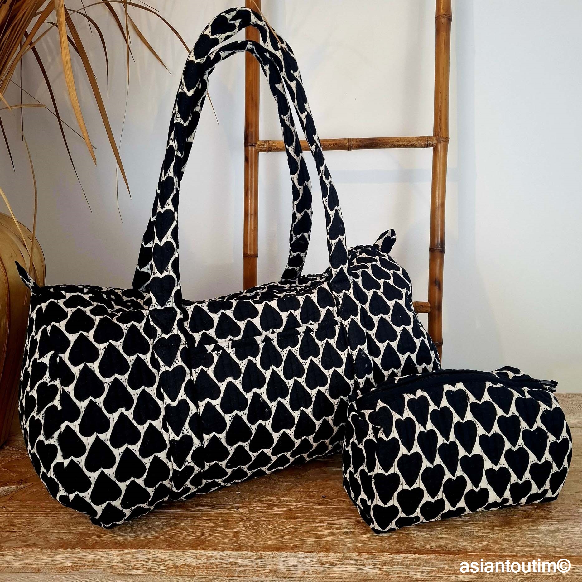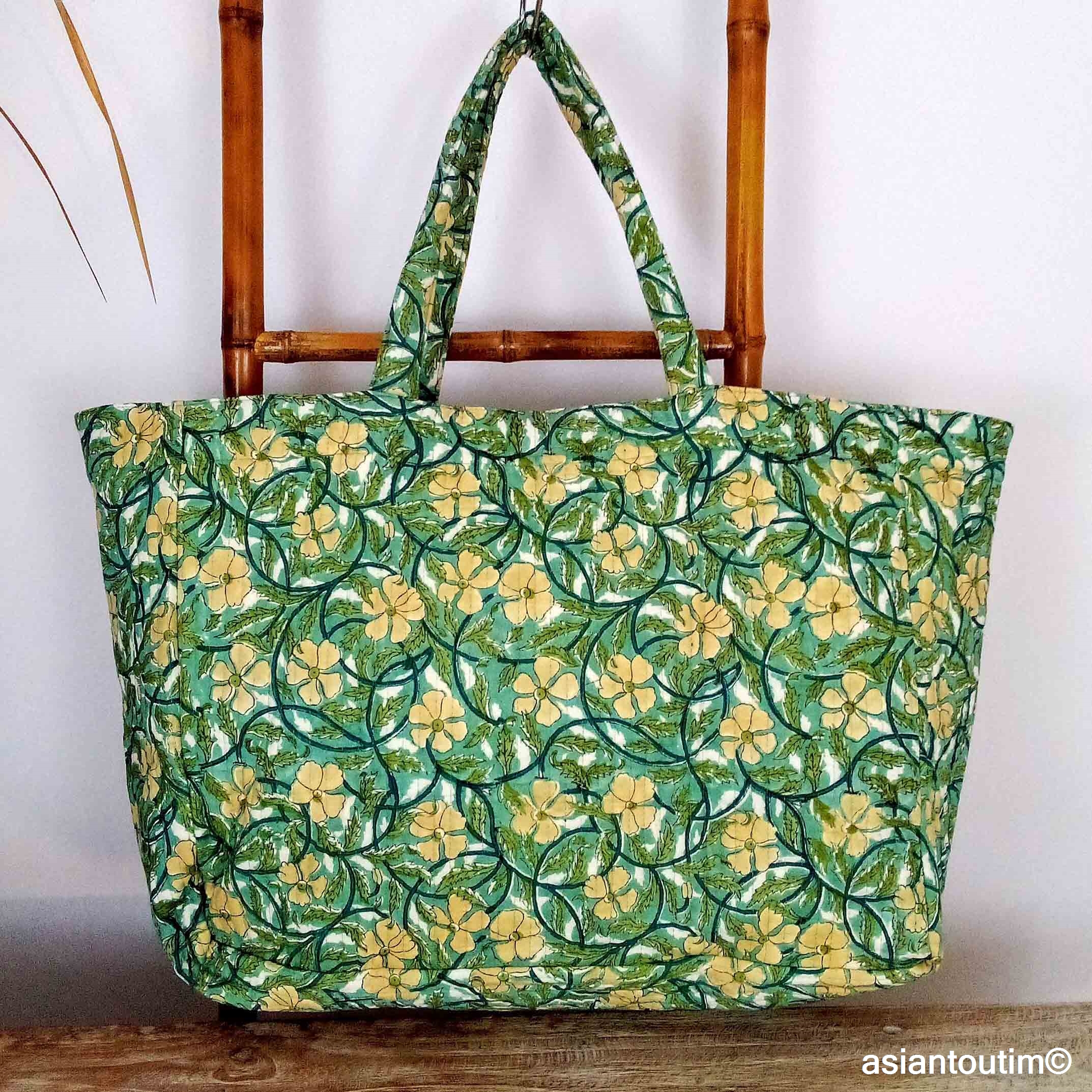 Fabriqué en Inde selon la technique artisanale du hand block print, chaque sac est imprimé manuellement à l’aide de tampons de bois, ce qui rend chaque pièce unique ou presque. Ce sac bowling artisanal en coton est produit en toutes petites séries, respectant un savoir-faire ancestral.