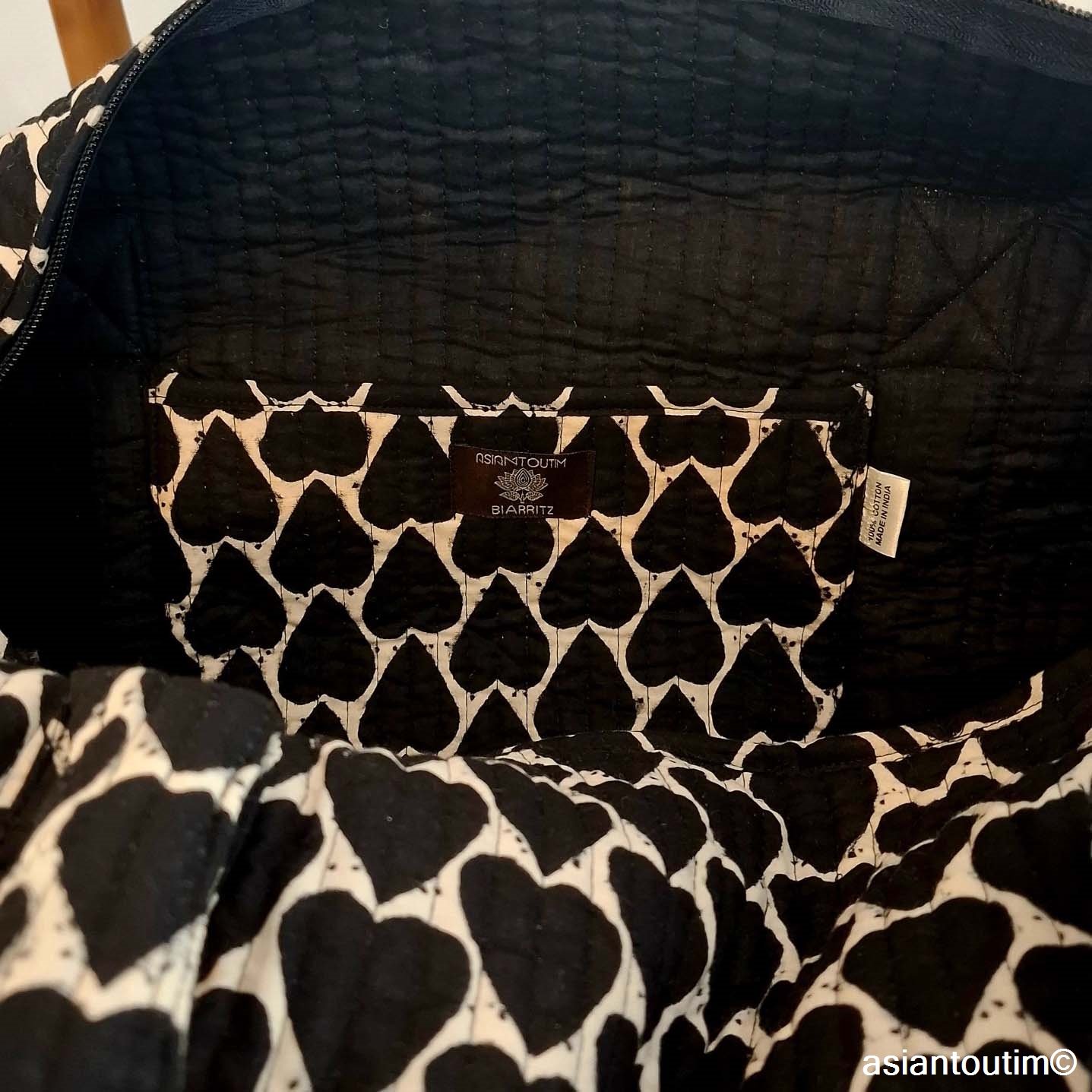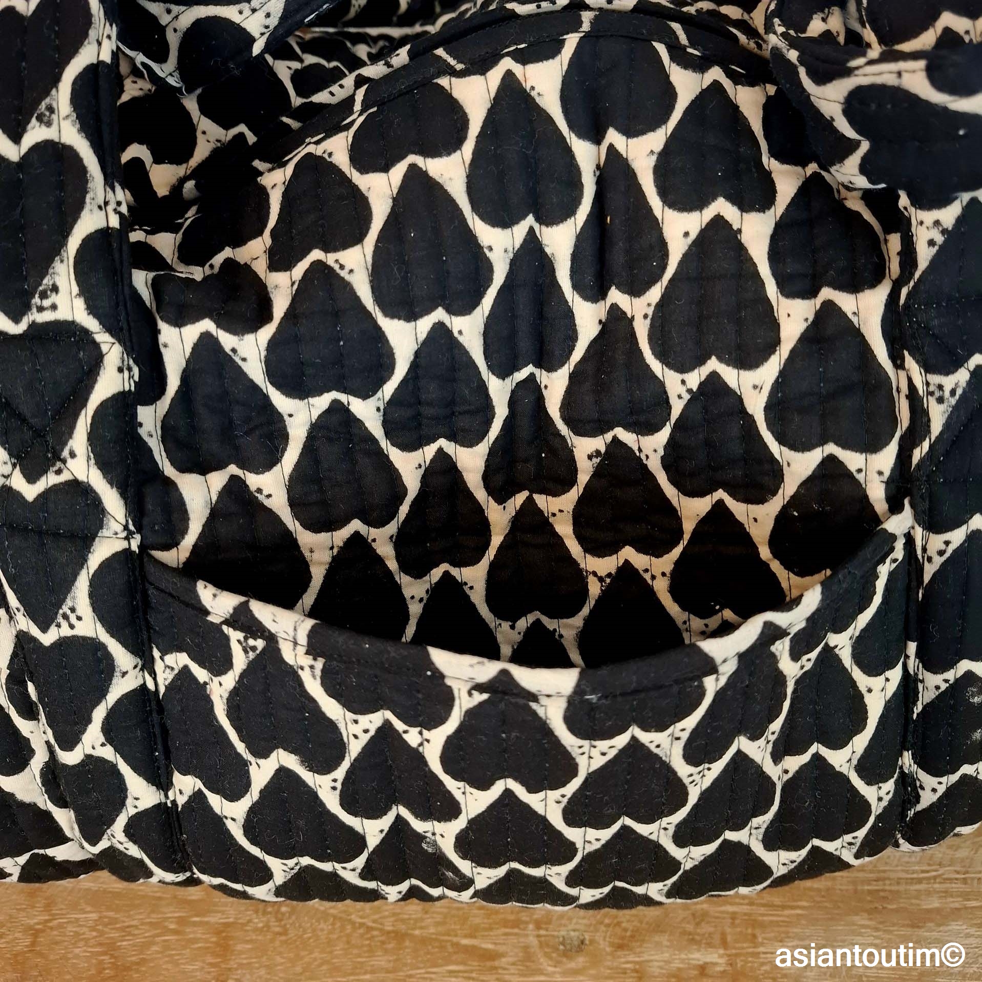 Fabriqué en Inde selon des techniques traditionnelles, ce sac est réalisé en petite quantité exclusivement pour notre boutique. Chaque pièce est imprimée à la main à l’aide de tampons de bois gravés.