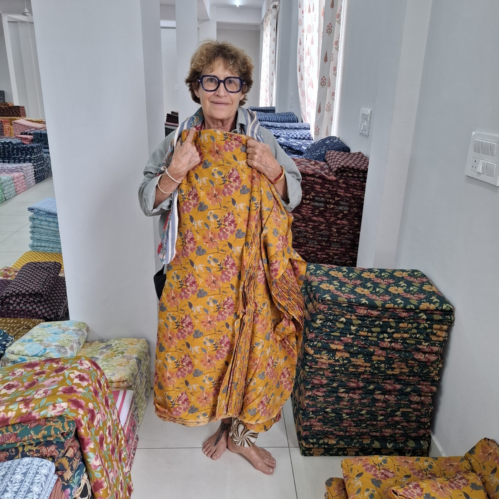 Les matières utilisées sont soigneusement sélectionnées : principalement du coton indien imprimé au tampon de bois, une technique ancestrale appelée block print, emblématique du Rajasthan.