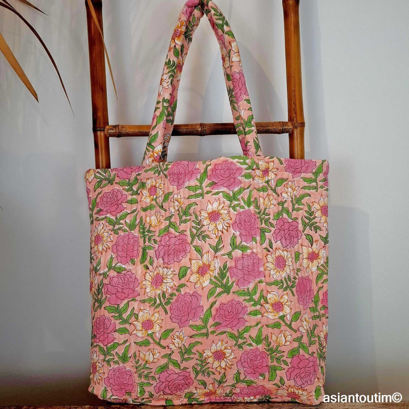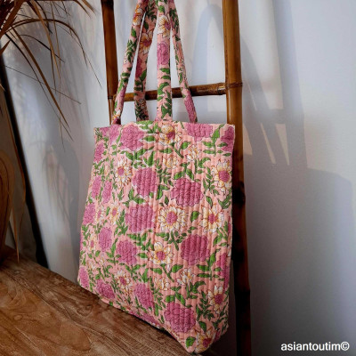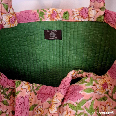 Imprimé à la main grâce à la technique du tampon de bois ou hand block print, technique d'impression ancestrale indienne, le tote bag de taille idéale devient l'indispensable. Intérieur uni, 100 % coton se lave à la main ou lavage doux en machine.