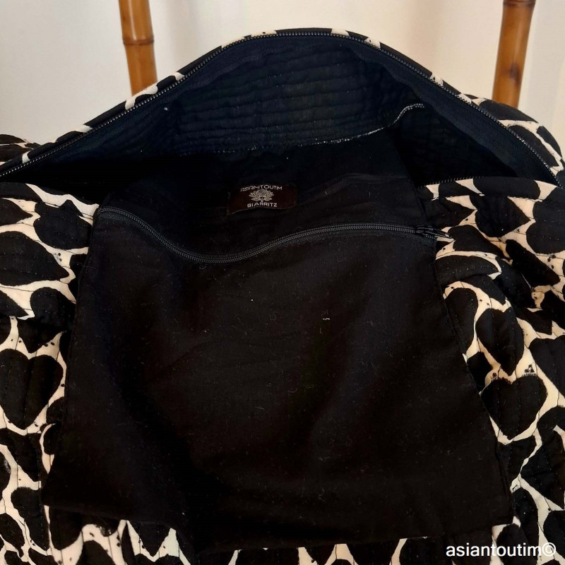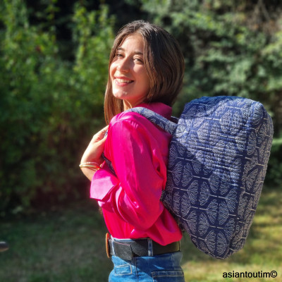 Sac matelassé zippé avec une poche intérieure zippée aussi. 100 % coton, tissu intérieur uni, extérieur imprimé à la main. Lavage délicat à 30°.