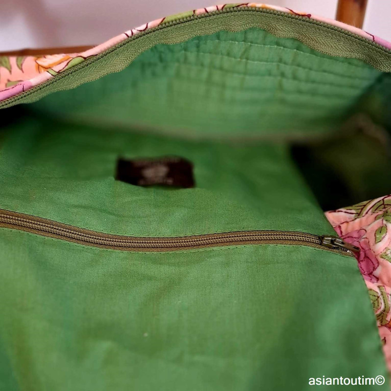 100 % coton, imprimé à la main grâce à la technique du tampon de bois ou hand block print, technique d'impression ancestrale indienne. Toujours de toutes petites séries dans mes collections imprimées main, il n'est pas unique mais presque !